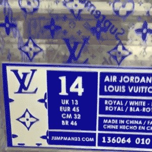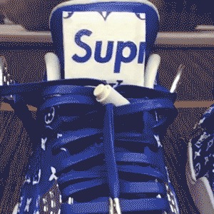 蓝白撞色的鞋面印花灵感源于 LV 和 Supreme 此前的联名花纹,后跟浮雕呈现的 LV Logo 霸气十足,鞋带头和鞋带扣则采用金属质感的银色点缀,亮眼非凡!