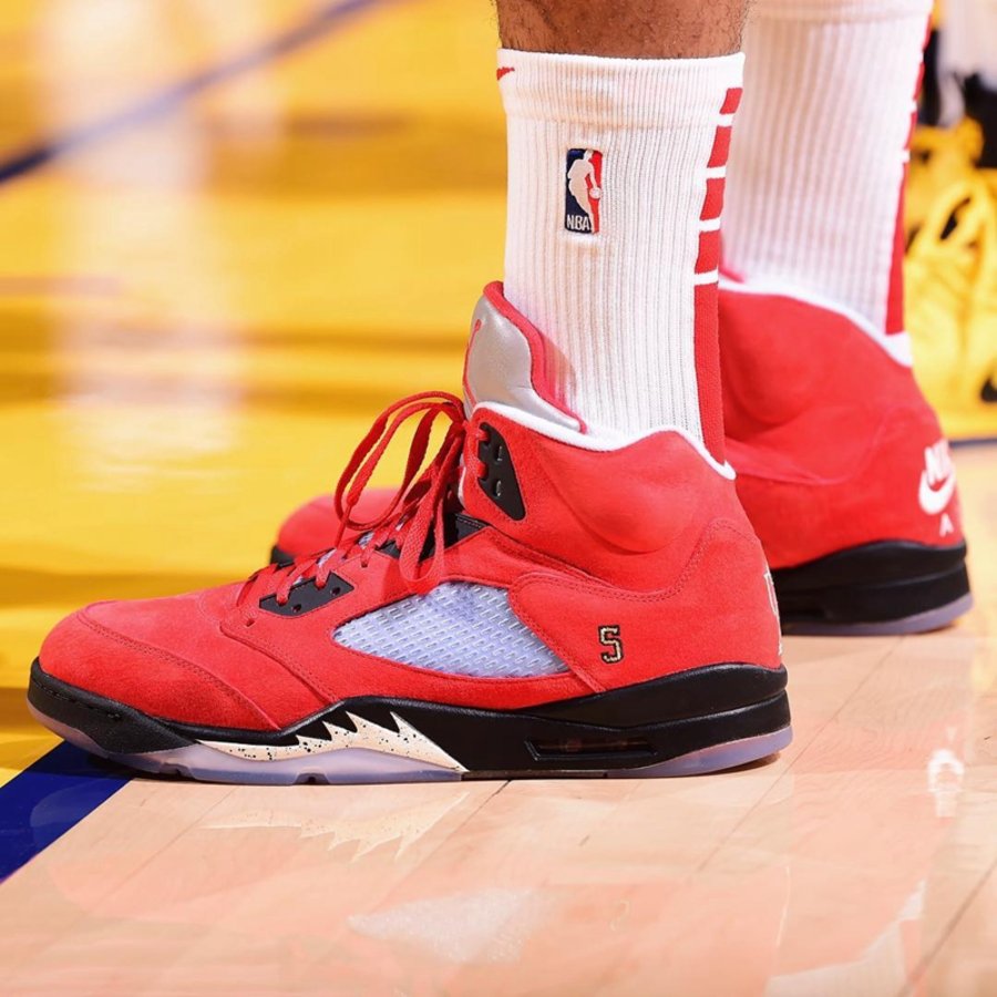 亲友限定版本采用大学红配色,在 AJ5 标志性的透气网面上采用了冰蓝色调,并将其中一只鞋经典的 23 号刺绣,改为数字 5 示人,后跟处的 Jumpman Logo 也换成 Trophy Room 的特殊标识。