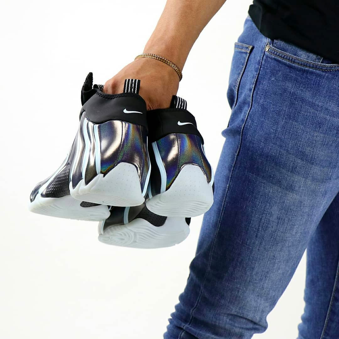 这双 Nike Air Flightposite One 不仅再现了「全息喷」的精妙鞋面效果,更以粗犷的线条勾勒,带来宜动亦静的视觉冲击力!