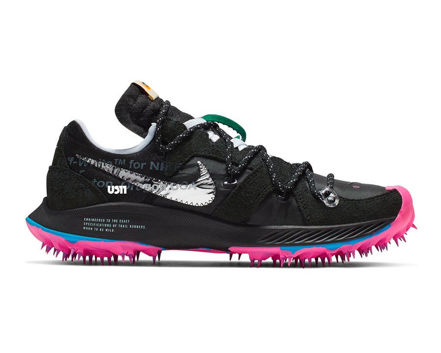 这款 OFF-WHITE x Nike Zoom Terra Kiger 5 一共包含了 3 款配色,以田径跑鞋为蓝本,软钉外底是最大的亮点。