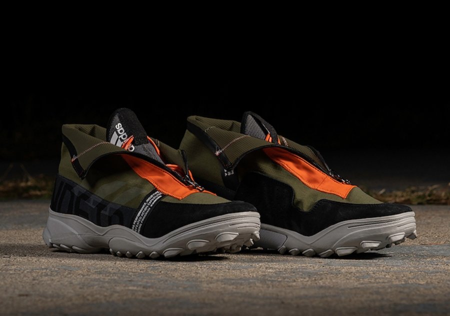 另一双 adidas GSG9 采用夸张的靴式造型,搭配拼接鞋面,拉链处采用橙色点缀,凸显质感的同时,还增强时尚感。