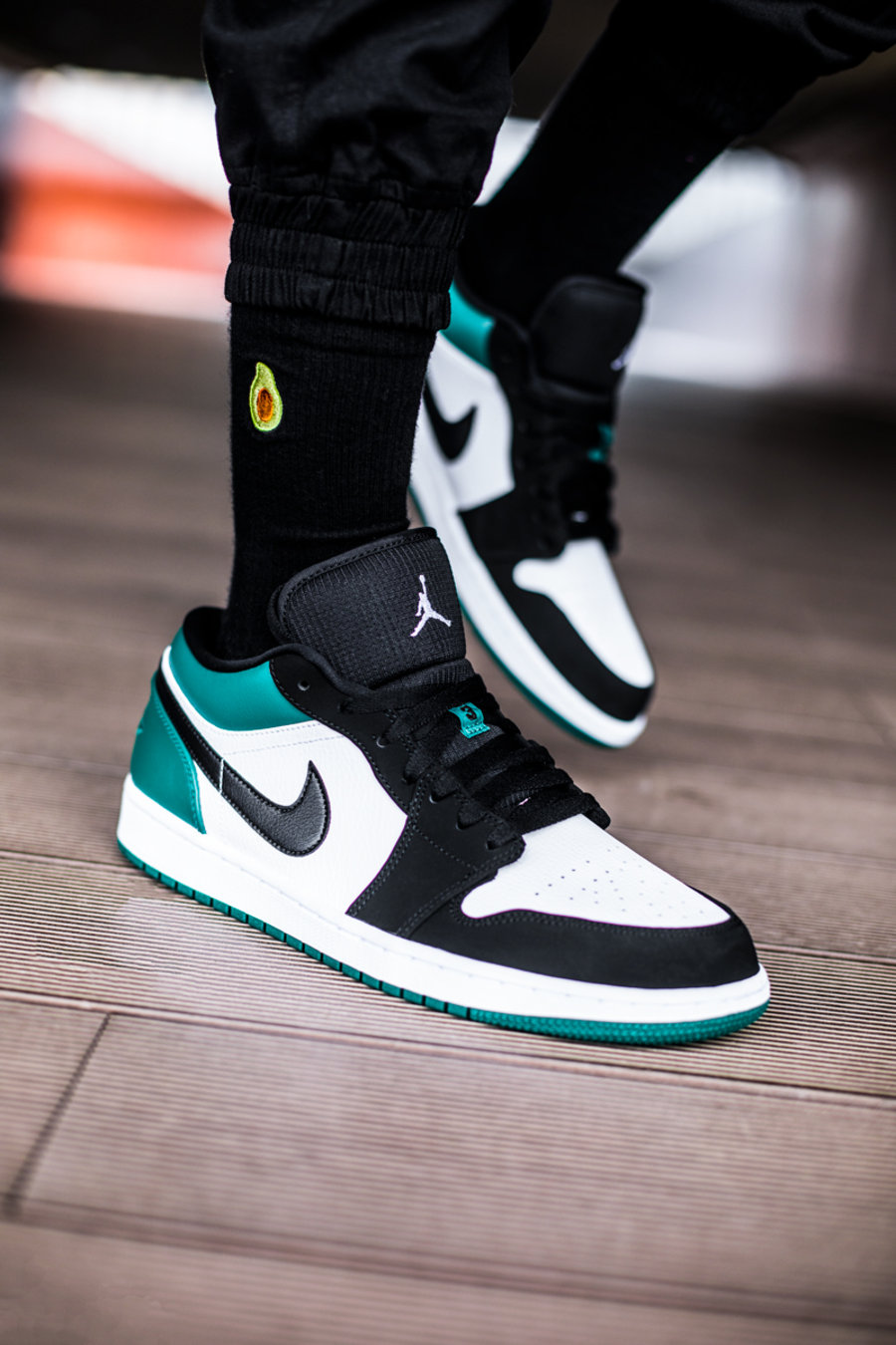 黑绿配色和去年发售的黑绿脚趾 Air Jordan 1 相同,鞋面以皮革材质和牛巴革组合拼接。