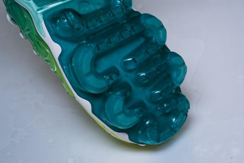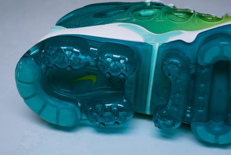 鞋面由蓝绿渐变配色呈现,搭配鞋身独特的透明框架,清爽又吸睛,贯穿全掌的 Vapormax 气垫带来澎湃的脚感。