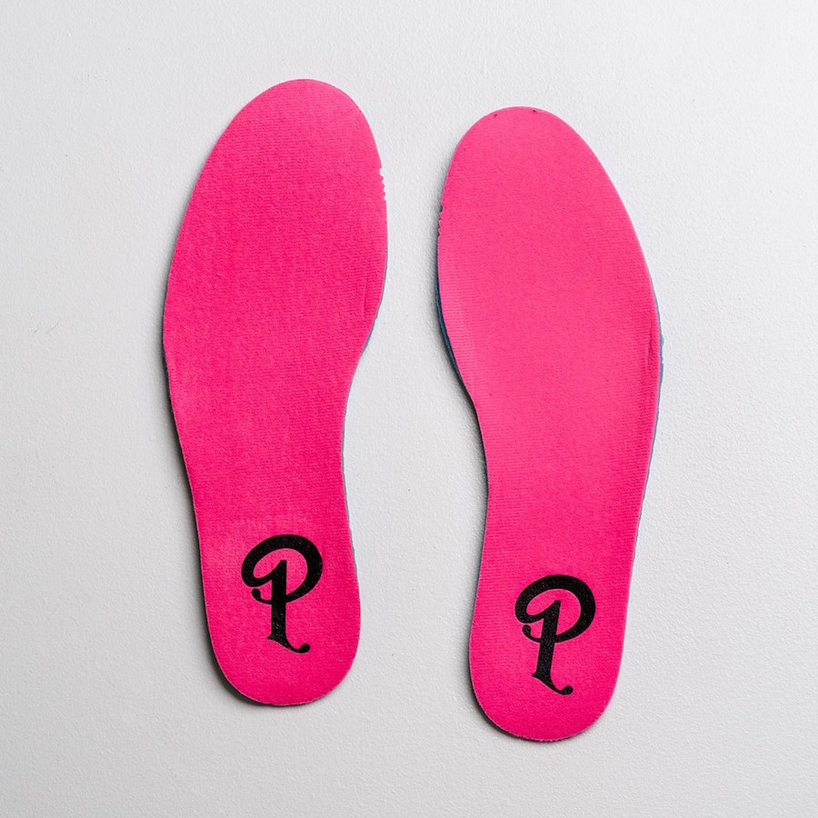 鞋垫的设计也同样用心,粉色的主色调与鞋带颜色呼应,花体的 P 字母也表明着与众不同的身份。