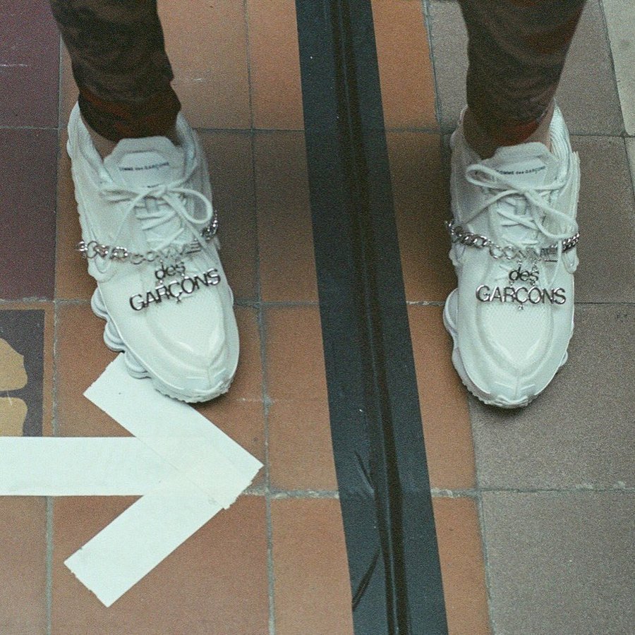 以纯白色全掌 Shox 跑鞋为蓝本,最大的特点当属鞋身的金属挂饰。链条穿过中底气柱缝隙,将带有 CDG 名称的金属吊牌固定在鞋身上。