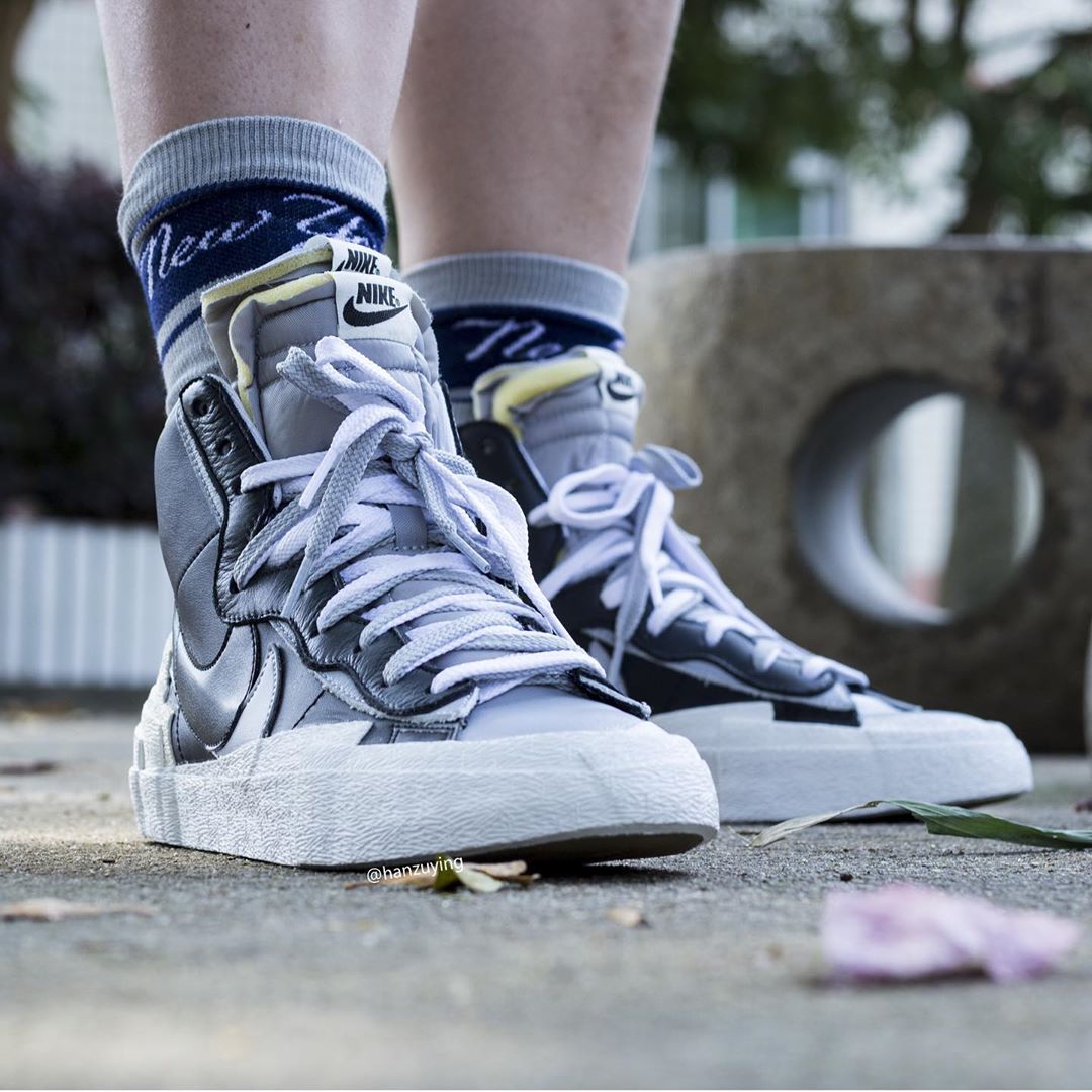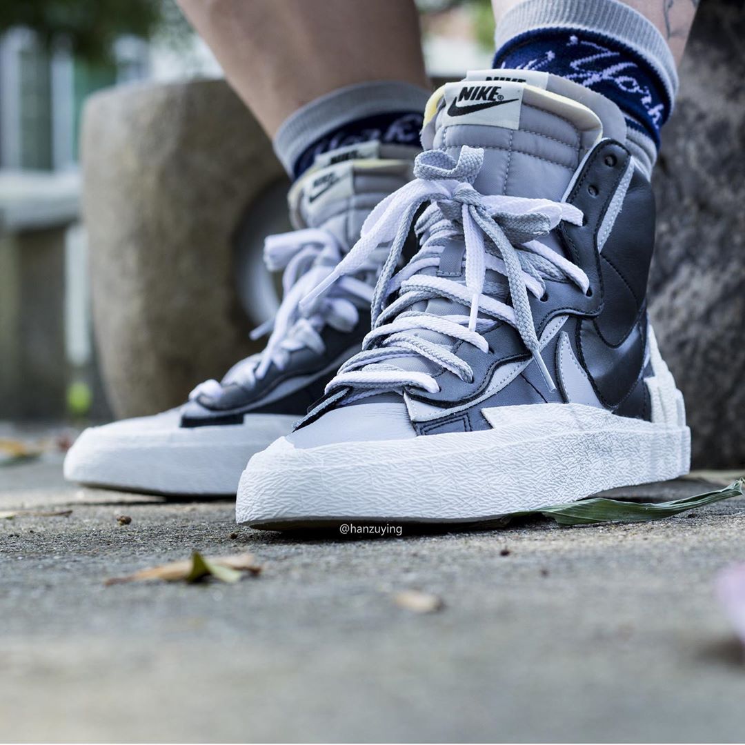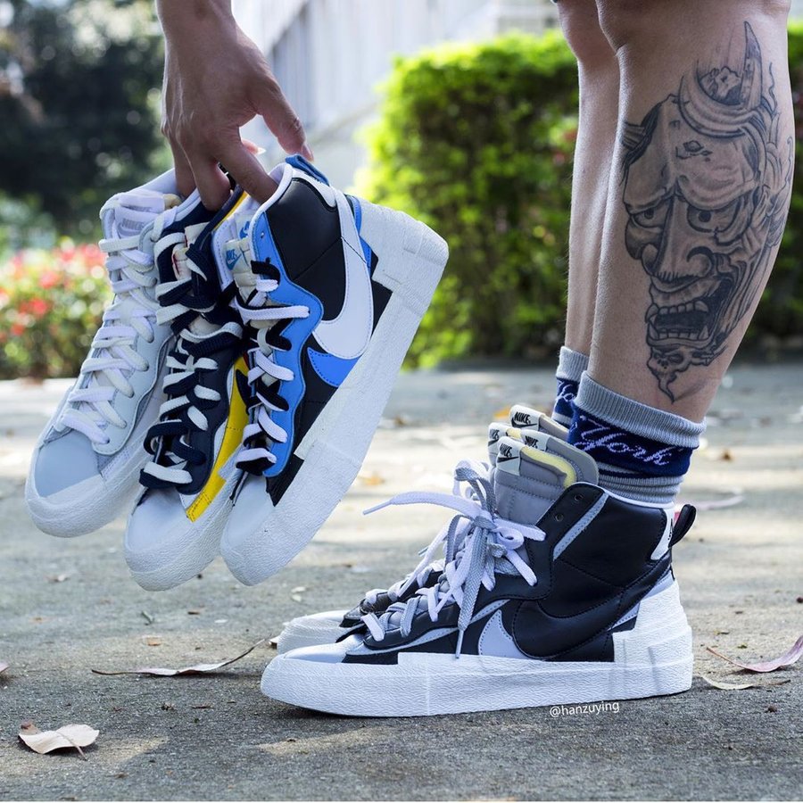 联名系列中的另一双 Sacai x Nike Blazer Mid 自然也不再遥远,近日 Instagram 球鞋摄影师 @hanzuying 就率先带来了四双配色的实物上脚照。