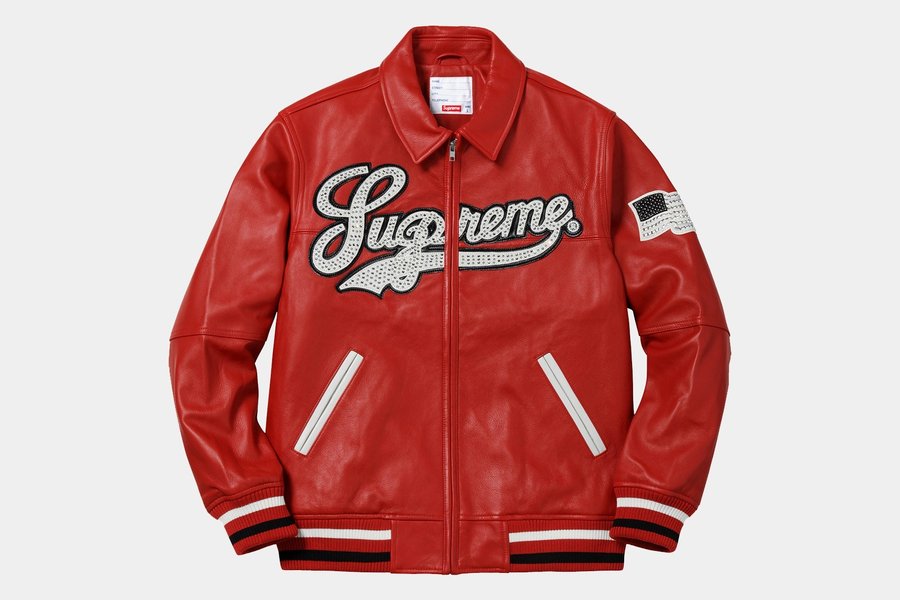 另一个猜测就是灵感来自 Supreme 之前的联名单品。与 Pelle Pelle 合作的皮衣,胸前的 Supreme 字体同样以铆钉装饰,也可能是联名 Air jordan 14 的灵感来源。