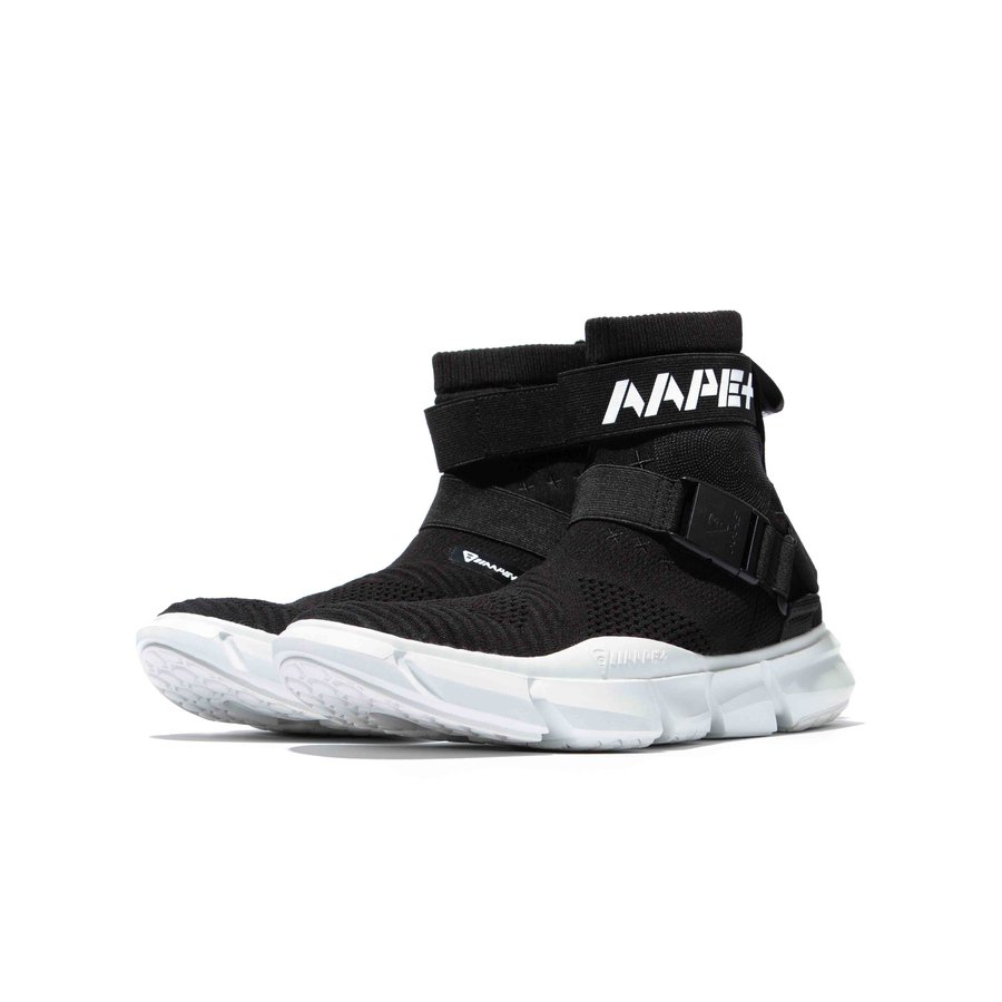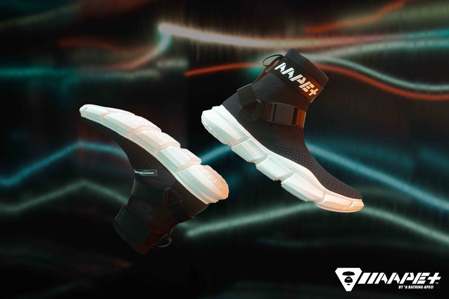 AAPE+ Awakening EX 作为系列推出的高帮款,全名为 「AAPE+ Potential - Shadow Spirit」,采用了近期热度较高的袜套鞋口设计,更加贴合脚腕。