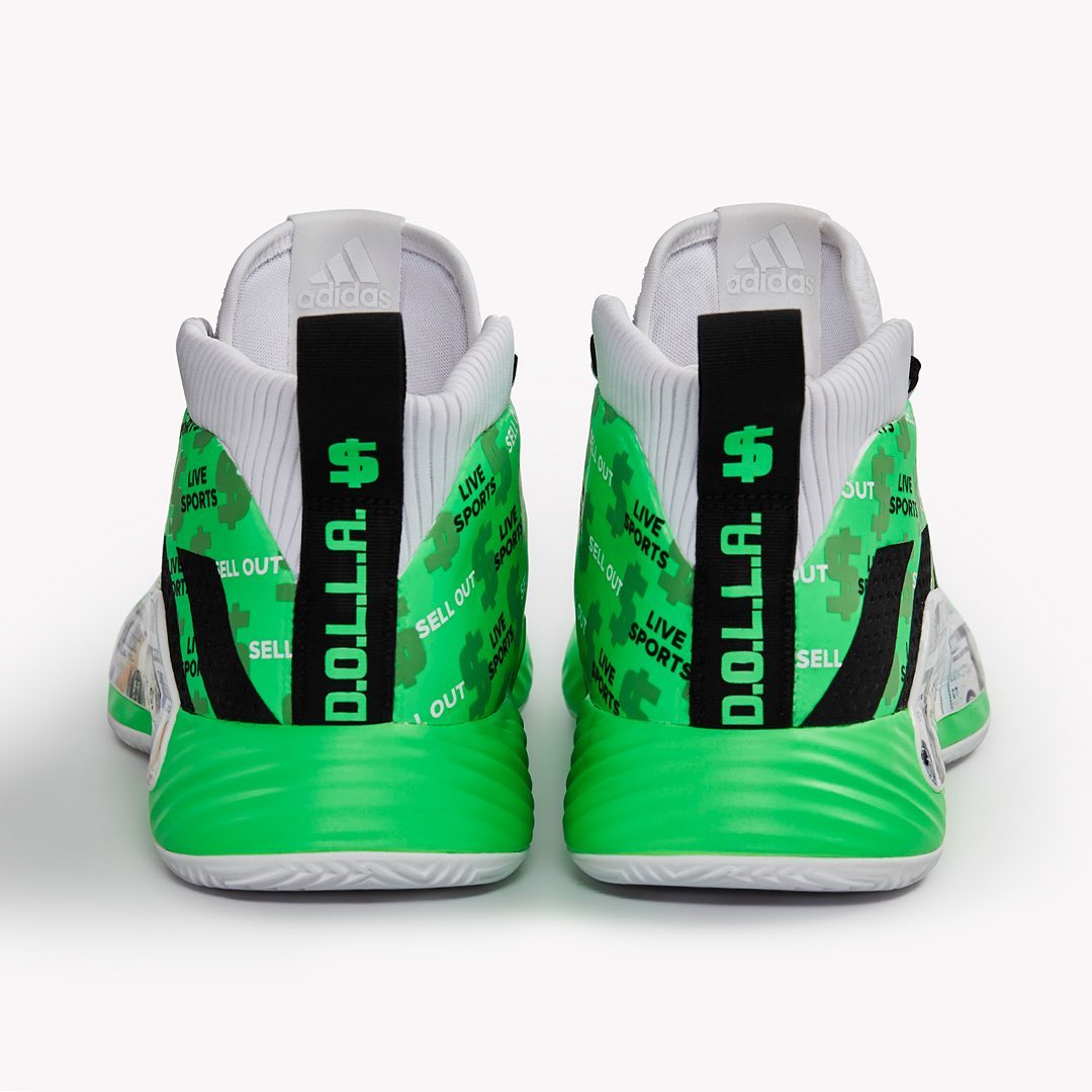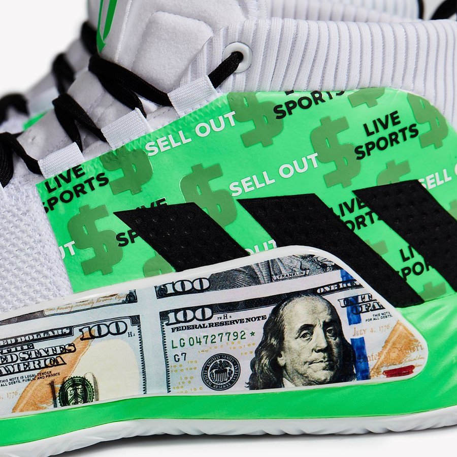 中底稳定模块以美元图案涂装,后跟的 $ 美元标志与 D.O.L.L.A. 字样既指美金主题,又代表利拉德本人。