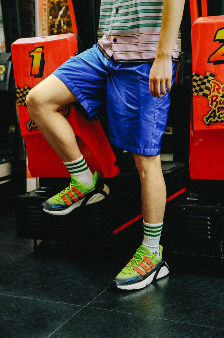 侧面经典的三道杠 Logo 一改低调造型,在荧光绿、橙、蓝三色装扮下,呈现强烈的视觉冲击感。