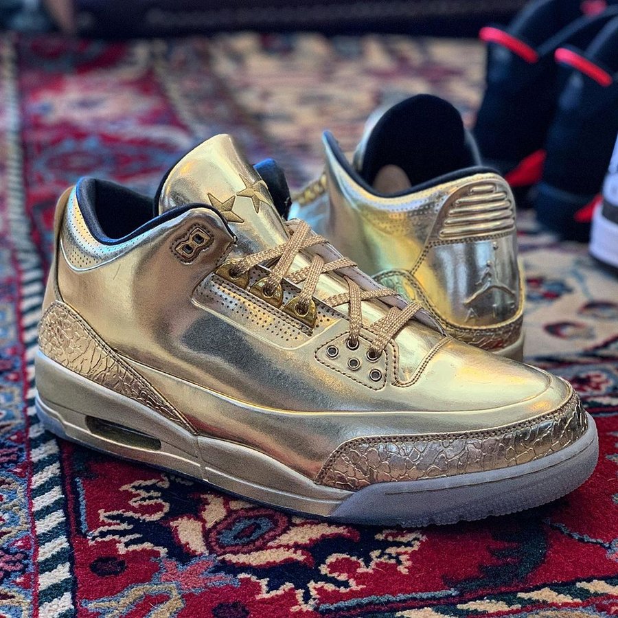 最后用一双神秘的 Air Jordan 3 收尾,通体液态银覆盖,鞋舌还有三颗星星刺绣,来历身份不明。