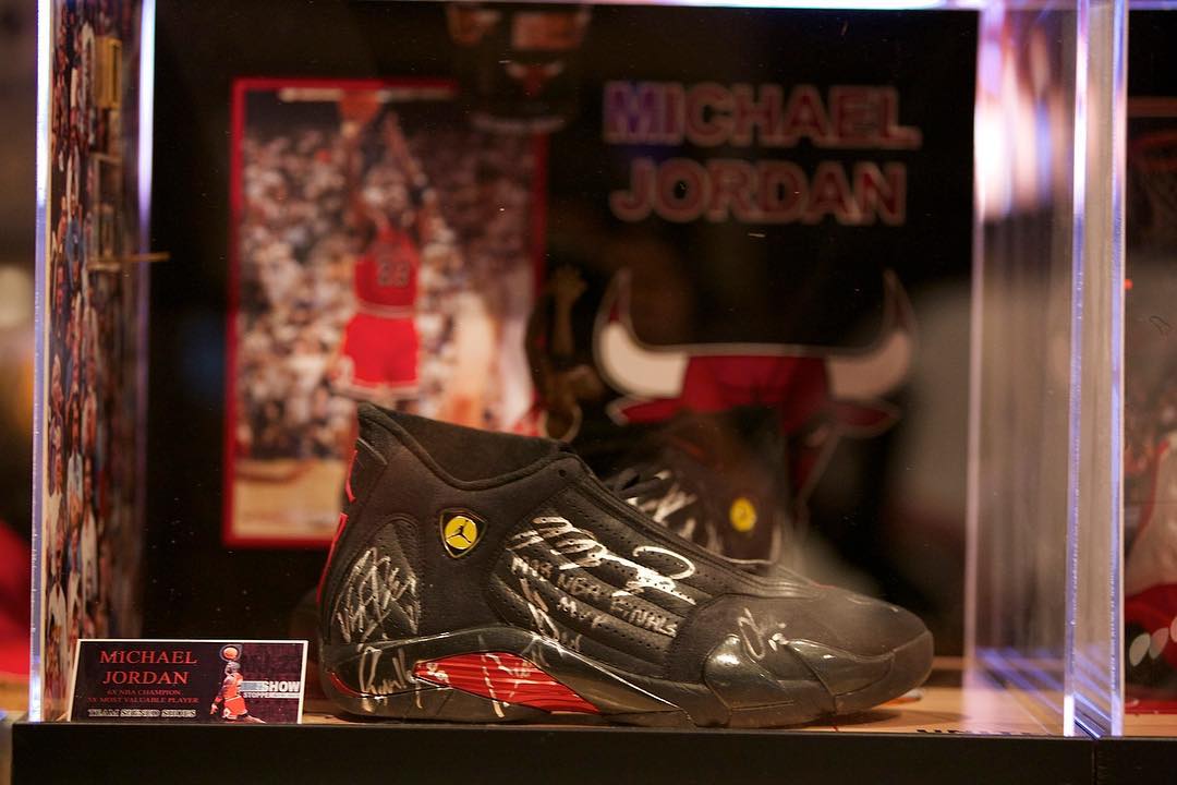 这双最后一投 Air Jordan 14 PE 可不得了,不仅是乔丹亲穿鞋身上还有公牛队所有队员和教练的签名,Kenny 在 1999 年花了 $15000 美元买到手,能想象现在的价值吗?