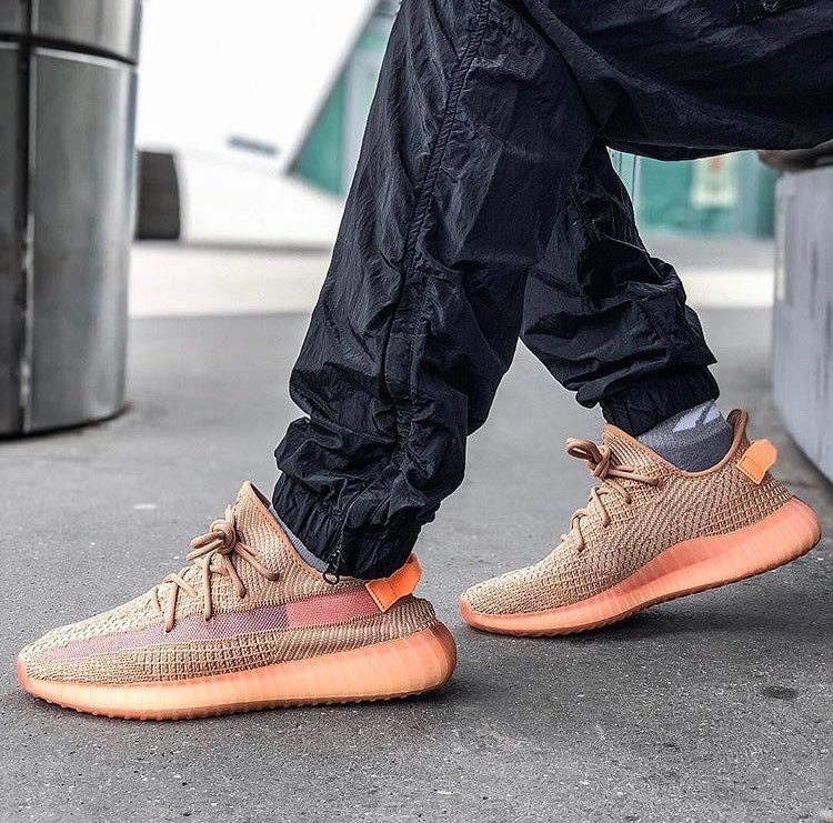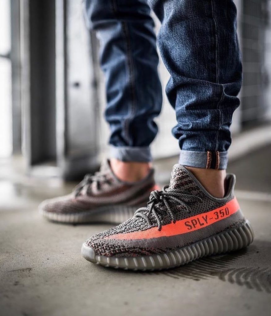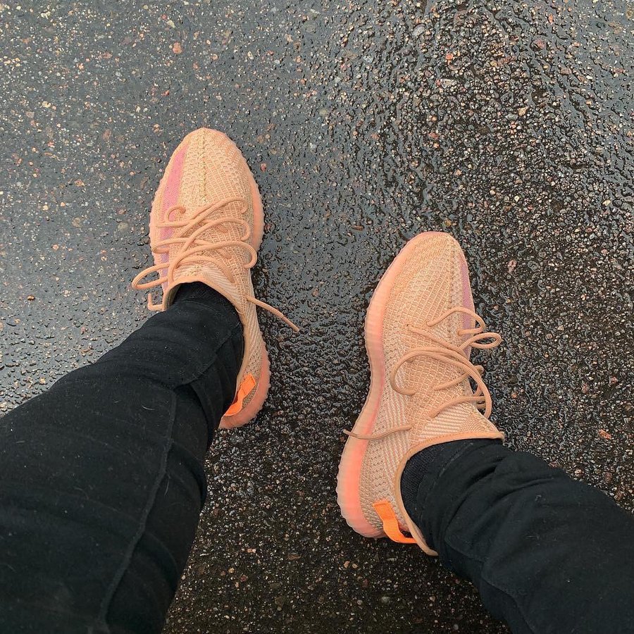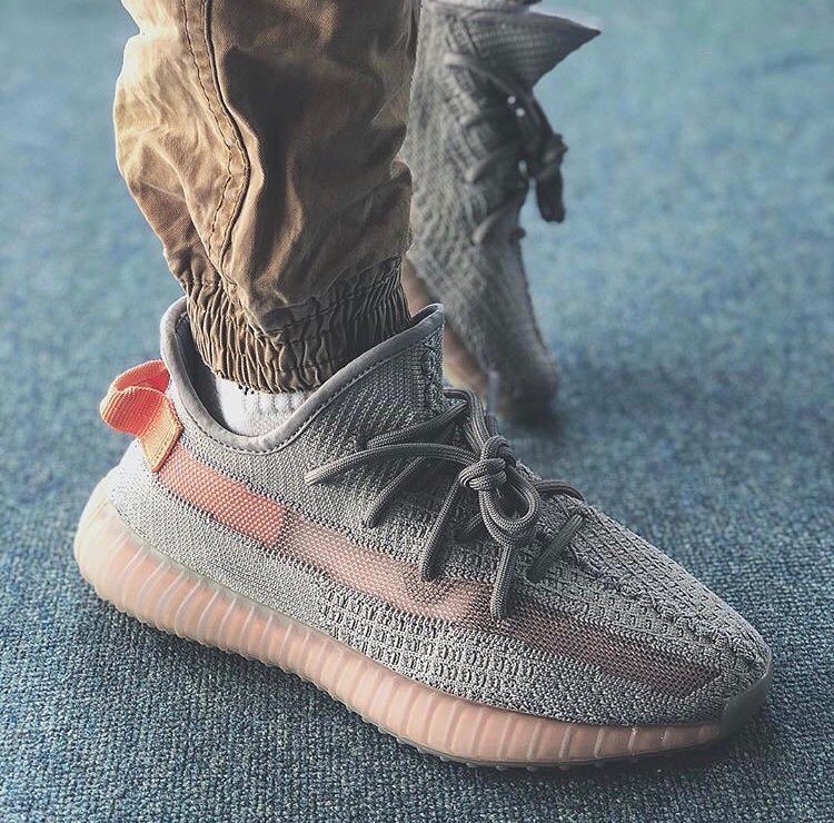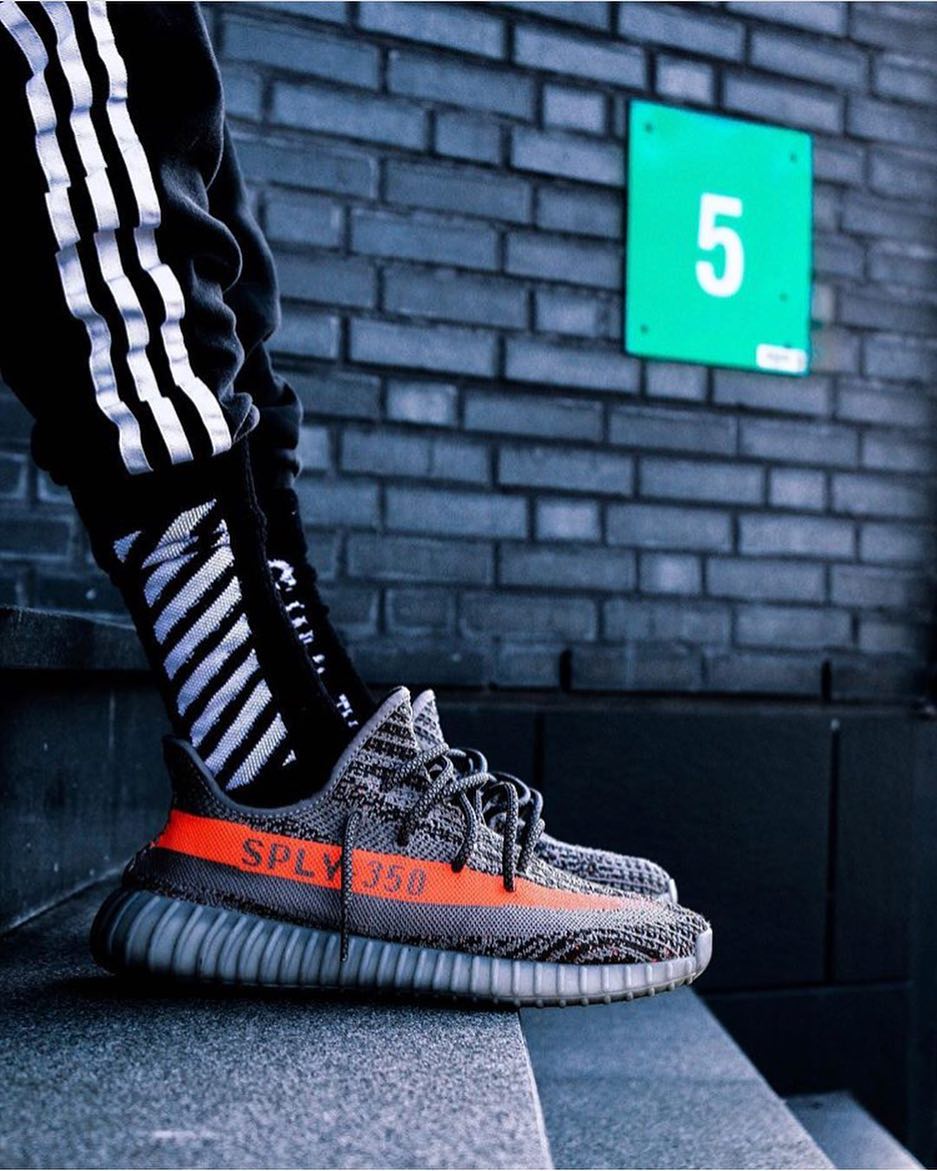 Yeezy 350 V2 第一款配色就是灰橙,兼有斑马暗纹和橙色油漆条两大元素。