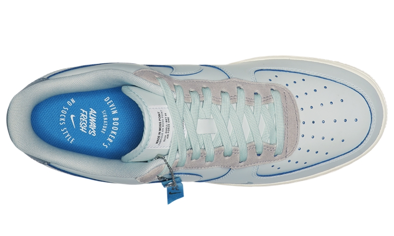 鞋款采用浅蓝色皮革鞋面搭配灰色麂皮覆层,后跟辅以金属质感的银色点缀。鞋带吊牌印有 D-Book 字样,后跟及鞋垫也都印有德文·布克专属标识,彰显鞋款特殊身份。