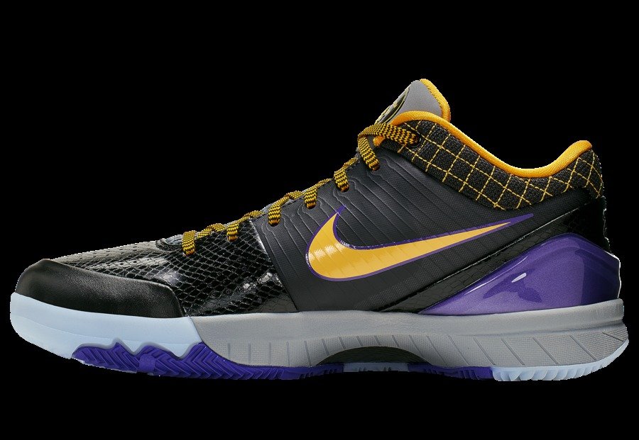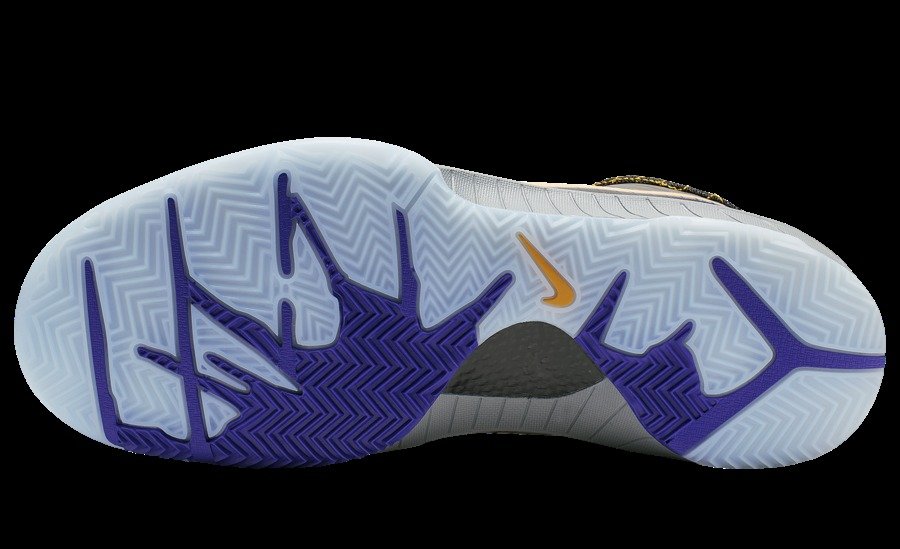 经典的紫金搭配黑色装扮,让人回想起当年全盛时代的湖人队。鞋头的蛇纹皮革搭配早期 Flywire 飞线科技,既彰显黑曼巴的气质,又尽显前卫的科技感。