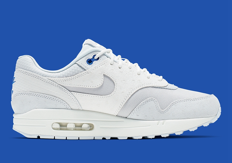 鞋面采用类似鸵鸟皮的灰色皮革材质,搭配暗藏圆形波点的白色皮革,规格极高,十分与众不同。后跟 Swoosh 辅以明亮的蓝色点缀,搭配纯白色中底和淡蓝色外底,清爽干净,非常适合夏季穿着。