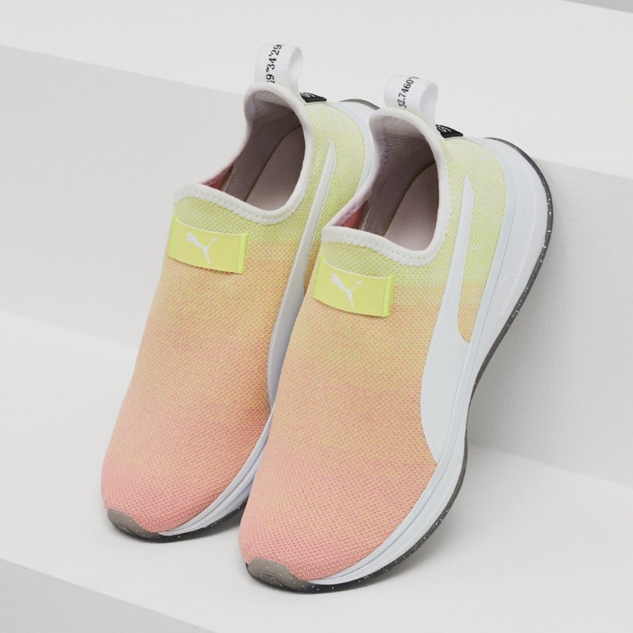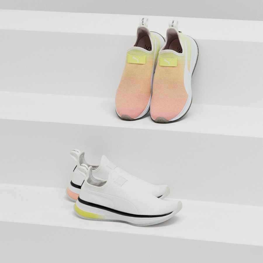 其中 SG Slip-On 释出两款配色。其中一双采用红黄渐变鞋身呈现,辅以白色 PUMA Logo 点缀,配色艳丽吸睛。