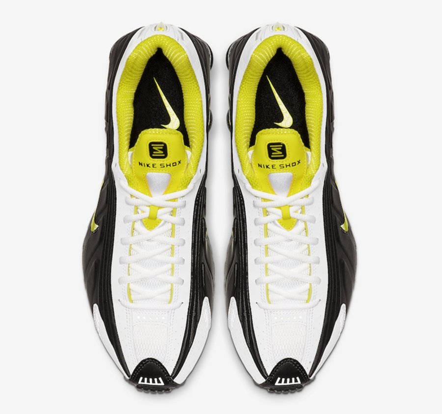 整体以黑白撞色示人,内衬、鞋侧 Swoosh 以及后掌 Shox 气柱等多处细节,均采用亮眼黄色点缀,为这双经典跑鞋增添几分时尚气息。