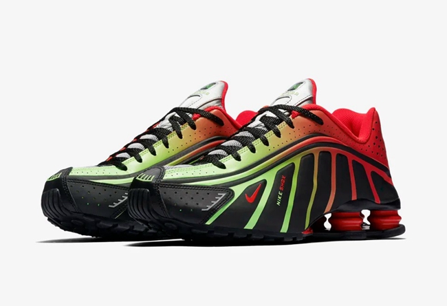 此次采用了极具科技感的 Nike Shox R4 为蓝本,分别呈现了抢眼的渐变红、绿,以及简洁白、红配色。