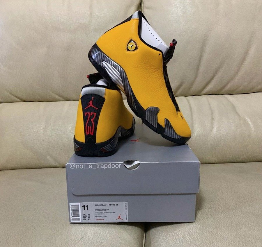 整双鞋以亮黄色为主调,优质皮革打造鞋面,中底处点缀的碳纤维纹理配合 Air Jordan 14 流线型十足的鞋身线条,彰显出法拉利跑车主题。