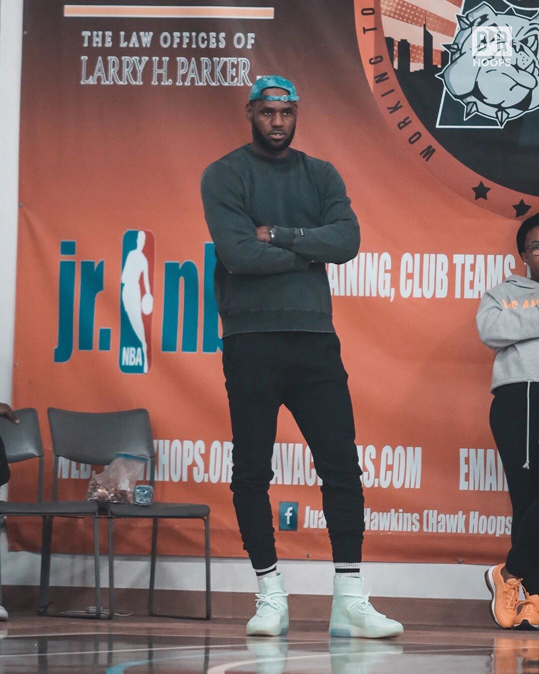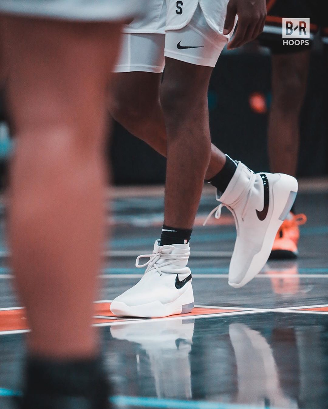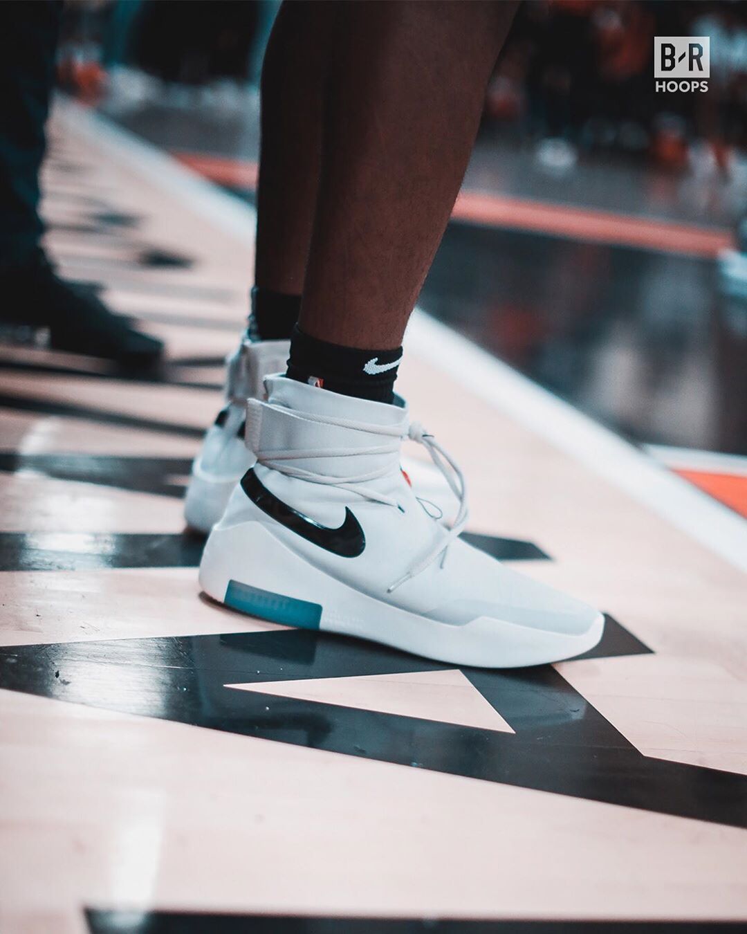 让人惊喜的是,场边的詹皇上脚了一双,即将发售的 Air Fear of God 1 青柠配色。