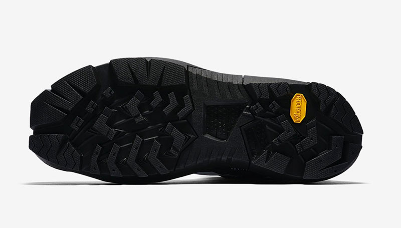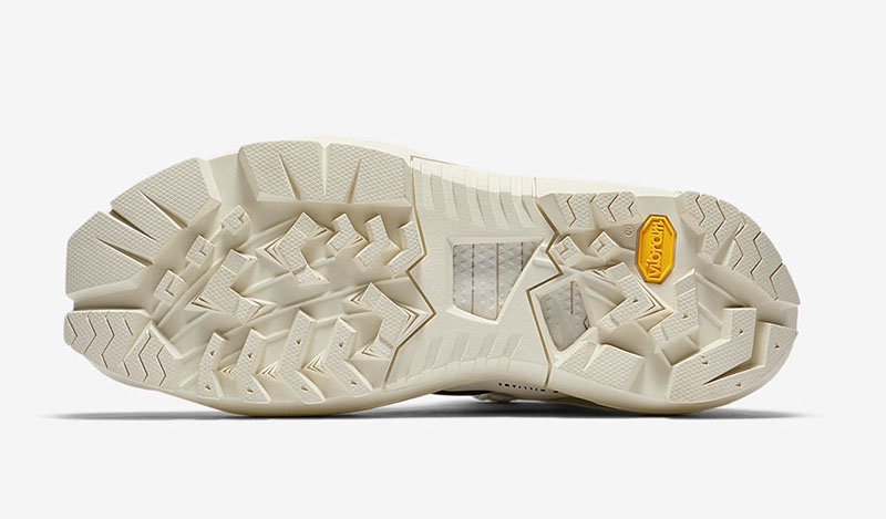 可拆卸外底采用 Vibram 大底打造,通过前后两条魔术绑带与内部鞋款相连,可以发现整个鞋身是 “卡” 在粗狂的外底之中!