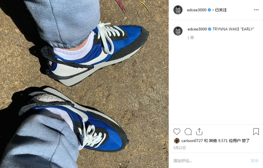 同时华人之光冠希哥又抢先在 Instagram 上,晒出了 UNDERCOVER x Nike Daybreak 的上脚照,毫不掩饰自己对这款联名的喜爱。