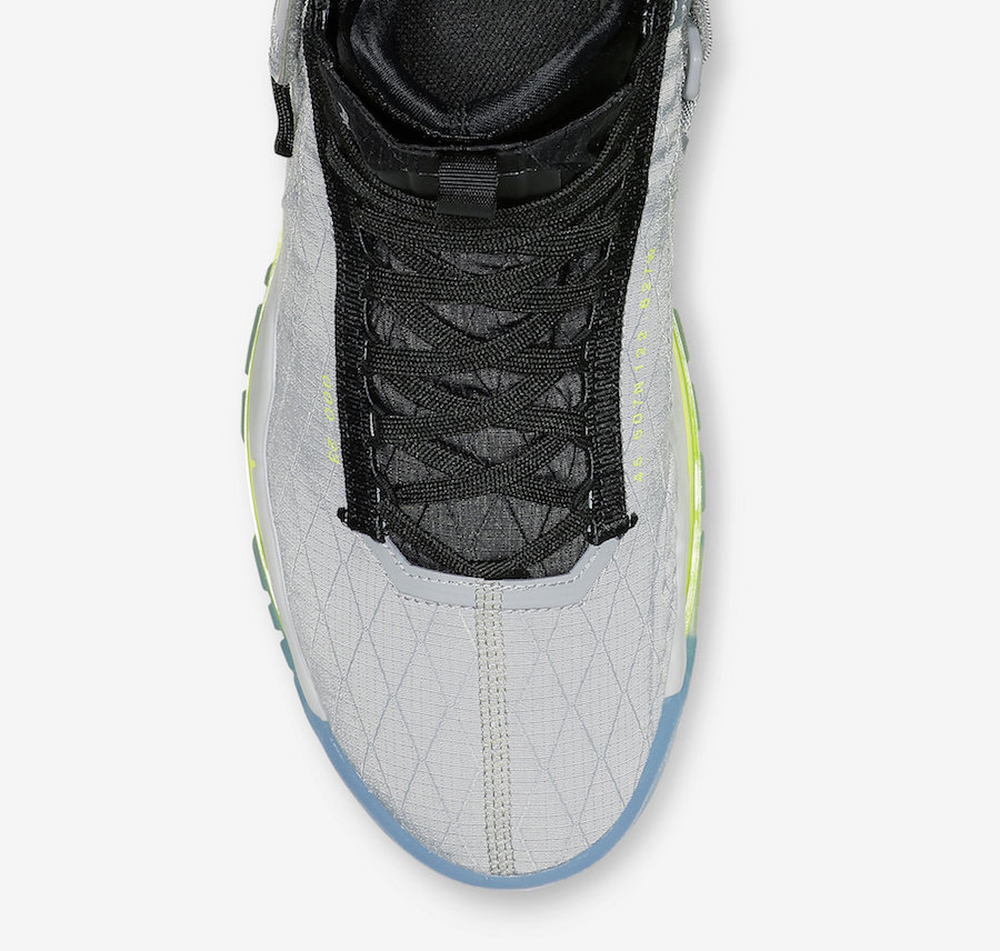 鞋面采用大面积机能材质覆盖,在灰色与荧光绿的相互碰撞下,营造出雪碧配色的既视感。