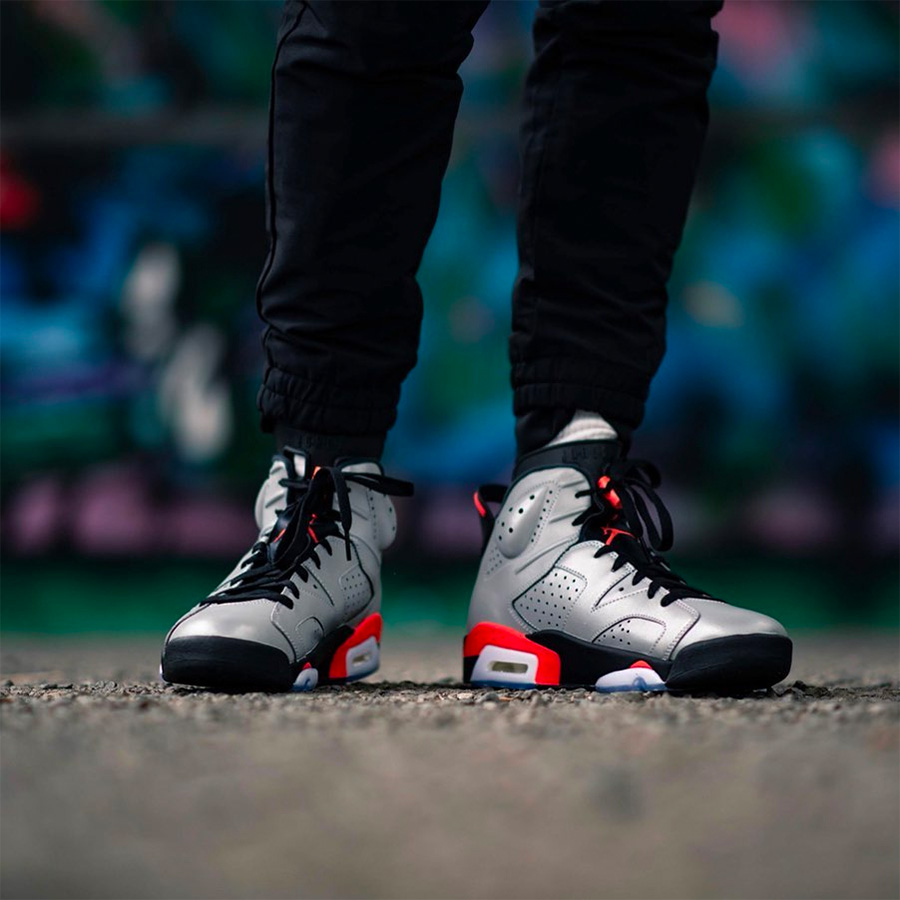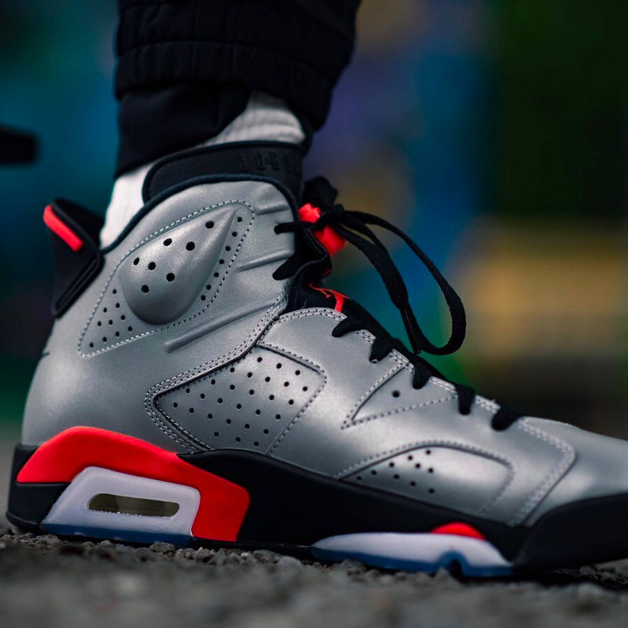 Air Jordan 6 以银色 3M 材质,搭配黑、红两色,呈现出十分简洁的鞋面设计质感。