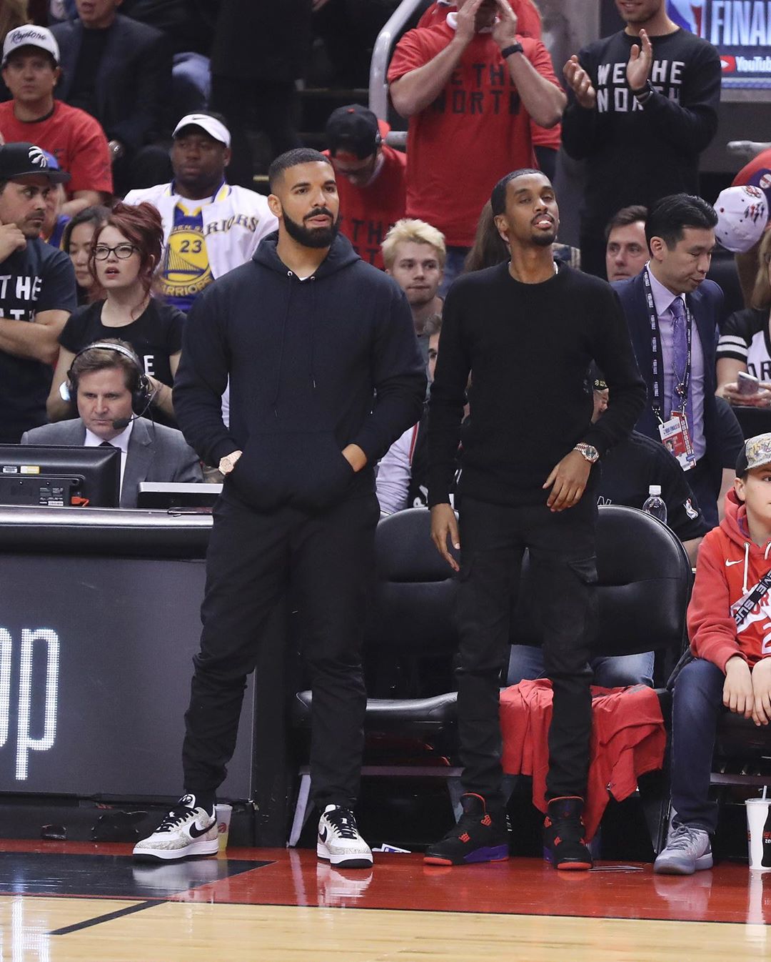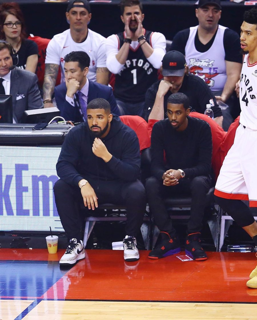 更值得一提的,是场边的忠实观众 Drake,此役上脚了一双灰蛇纹 Air Force 1。