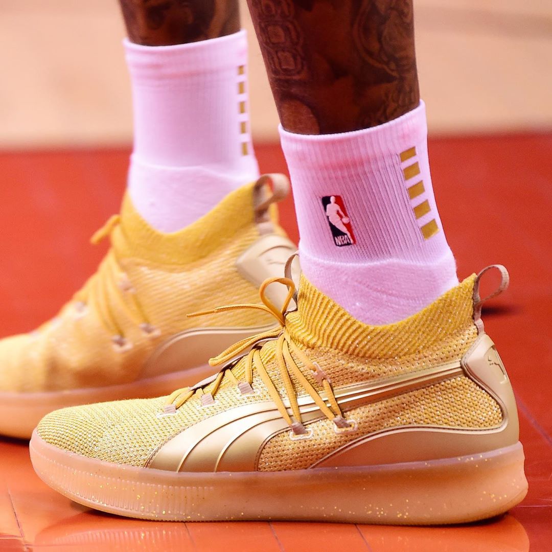 考辛斯穿了双亮眼的金色 Puma 系列篮球鞋,追梦上脚 Nike Hyperdunk X 新配色,奎因 · 库克则穿了 KD12 “90s Kid” 配色。