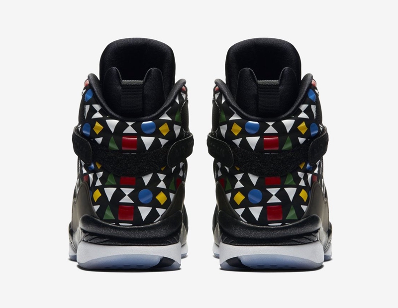 Air Jordan 8 采用黑色装扮,后跟处辅以彩色几何图案点缀,辨识度极高,让人过目不忘。