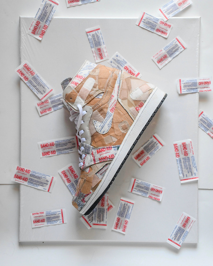 下面这双 Air Jordan 1 的鞋面全都用邦德创口贴覆盖,Swoosh 等细节则是用外包装点缀。