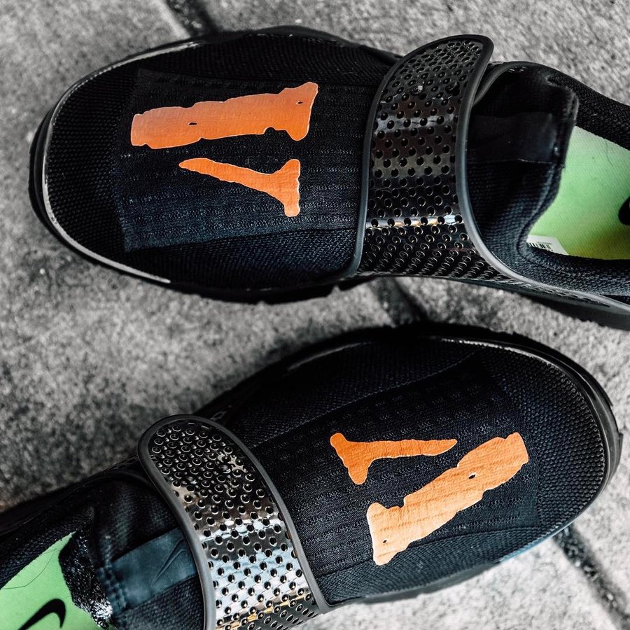 比如在这双 Nike Sock Dart 的鞋面印上 VLONE 的 Logo,两者的暗黑气质相辅相成。