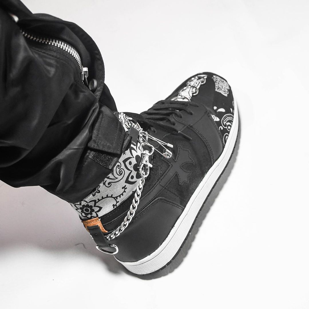 暗黑古典的克罗心同样能与 Air Jordan 1 “联名”,把 Swoosh 都改成了克罗心的经典图案,金属挂饰更是质感十足。