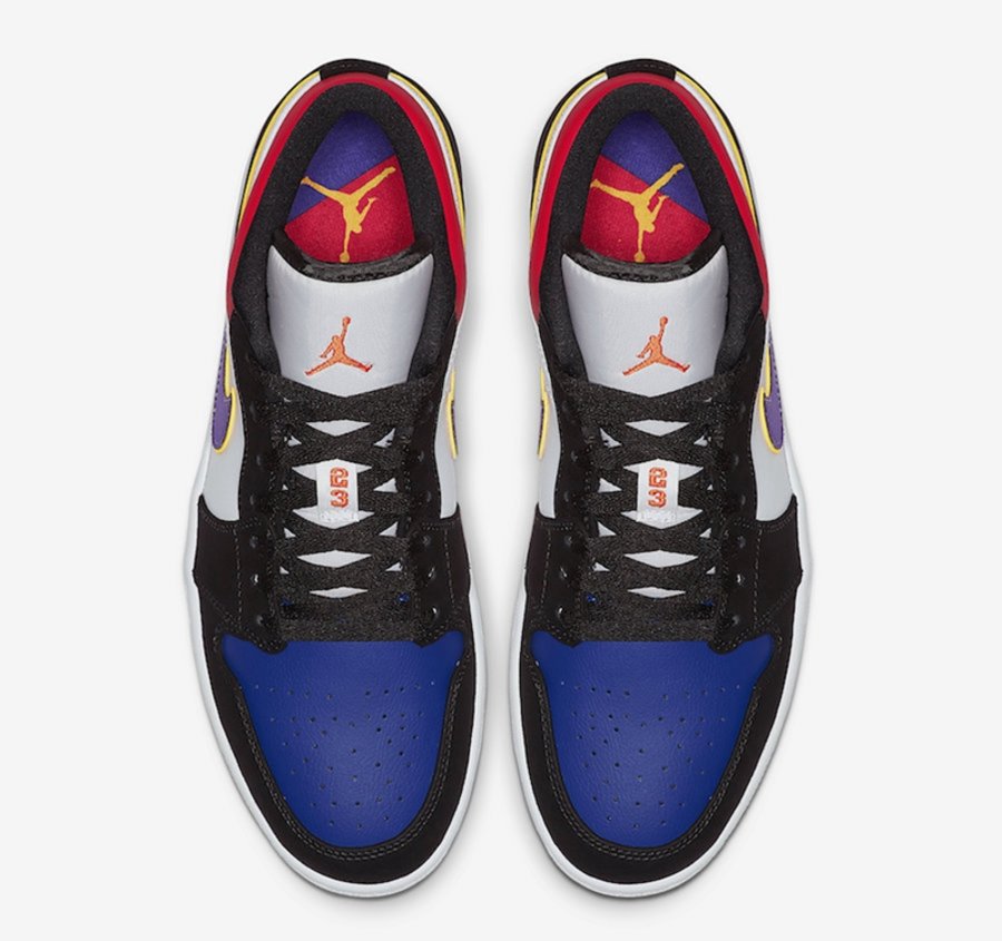 采用白色作为鞋面主色调,辅以蓝色、红色、黑色等多种颜色拼接呈现,鞋舌搭配橙色 Jumpman Logo 以及 “23” 字样点缀,颜色靓丽吸睛,非常与众不同。最大特点是 Swoosh 采用紫金装扮,颇有几分湖人队的风格。