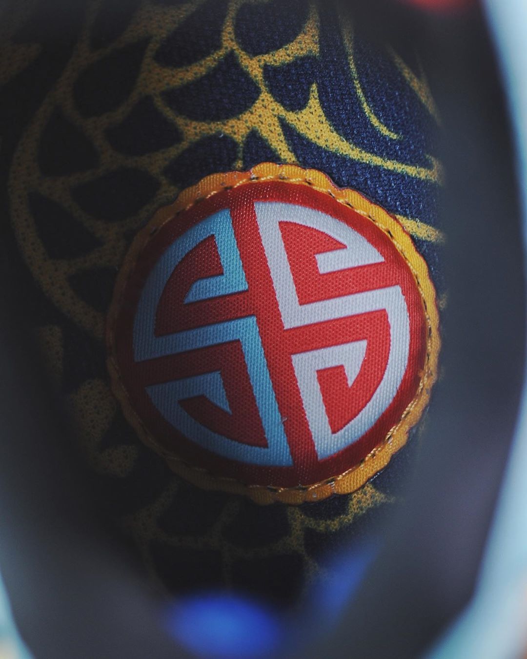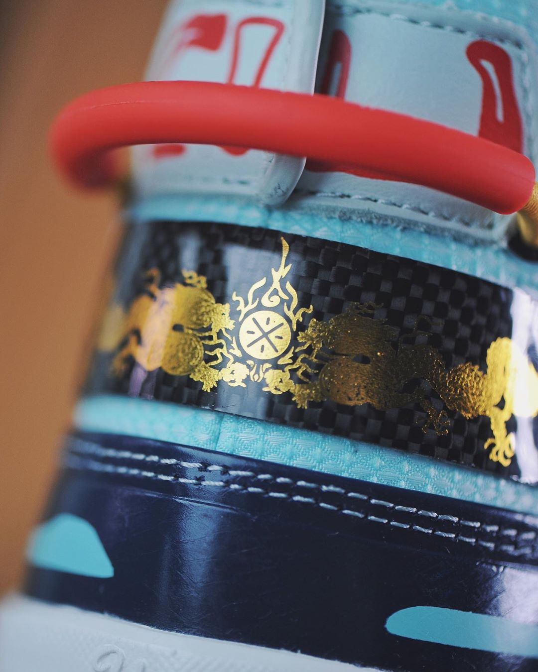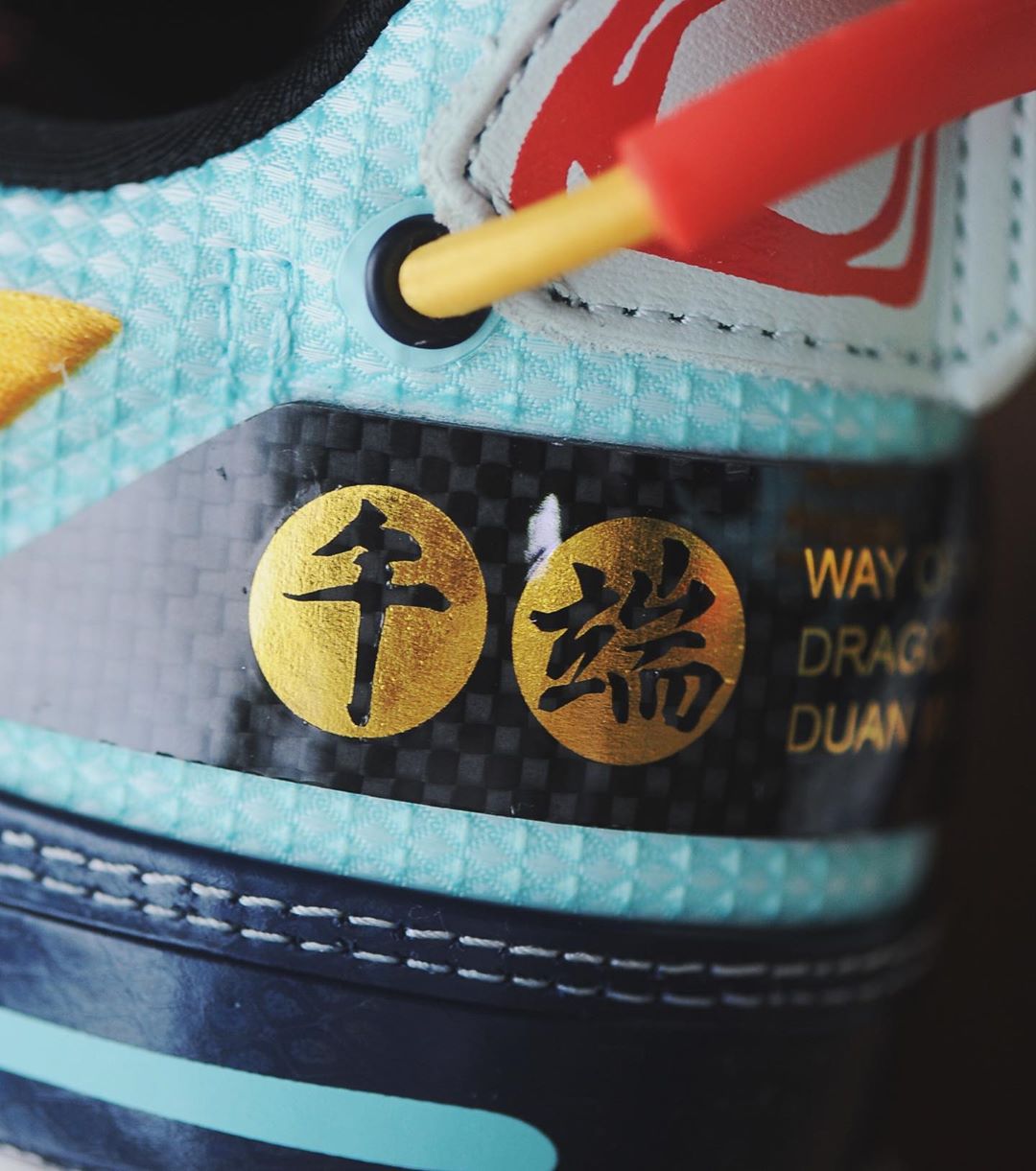 繁体中文 “叁” 点缀在鞋头,后跟同样以 “端午” 对照,烫金材质龙纹置于碳板之上,鞋垫还暗藏复古图腾。