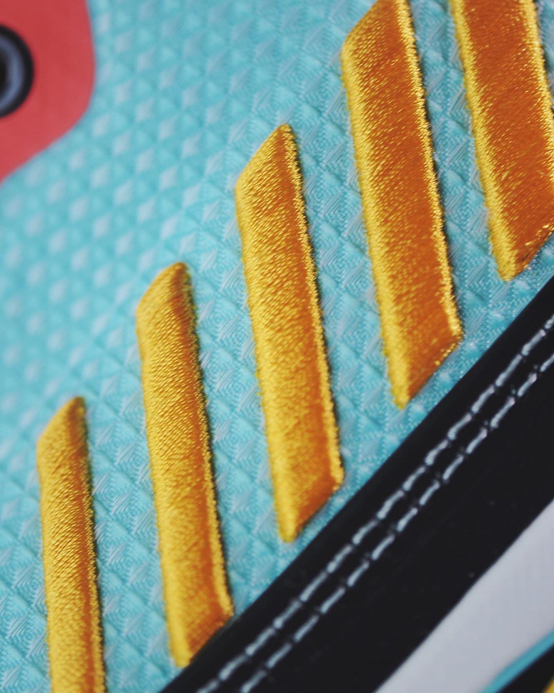 鞋面采用湖水绿为基底,黑、红两色勾勒。亮黄色韦德 Logo,刺绣警戒线呼应。