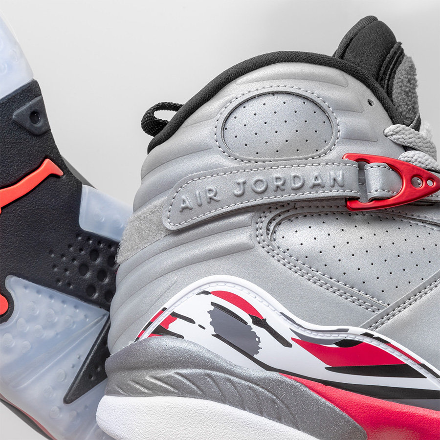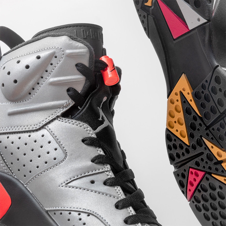 Air Jordan 6、Air Jordan 7 和 Air Jordan 8 三个经典鞋型都披上了银灰色的鞋面,全鞋面的 3M 反光材质加持,使得这个系列不仅有着不俗的科幻效果,在弱光环境下的反光效果更是让人难以回避!