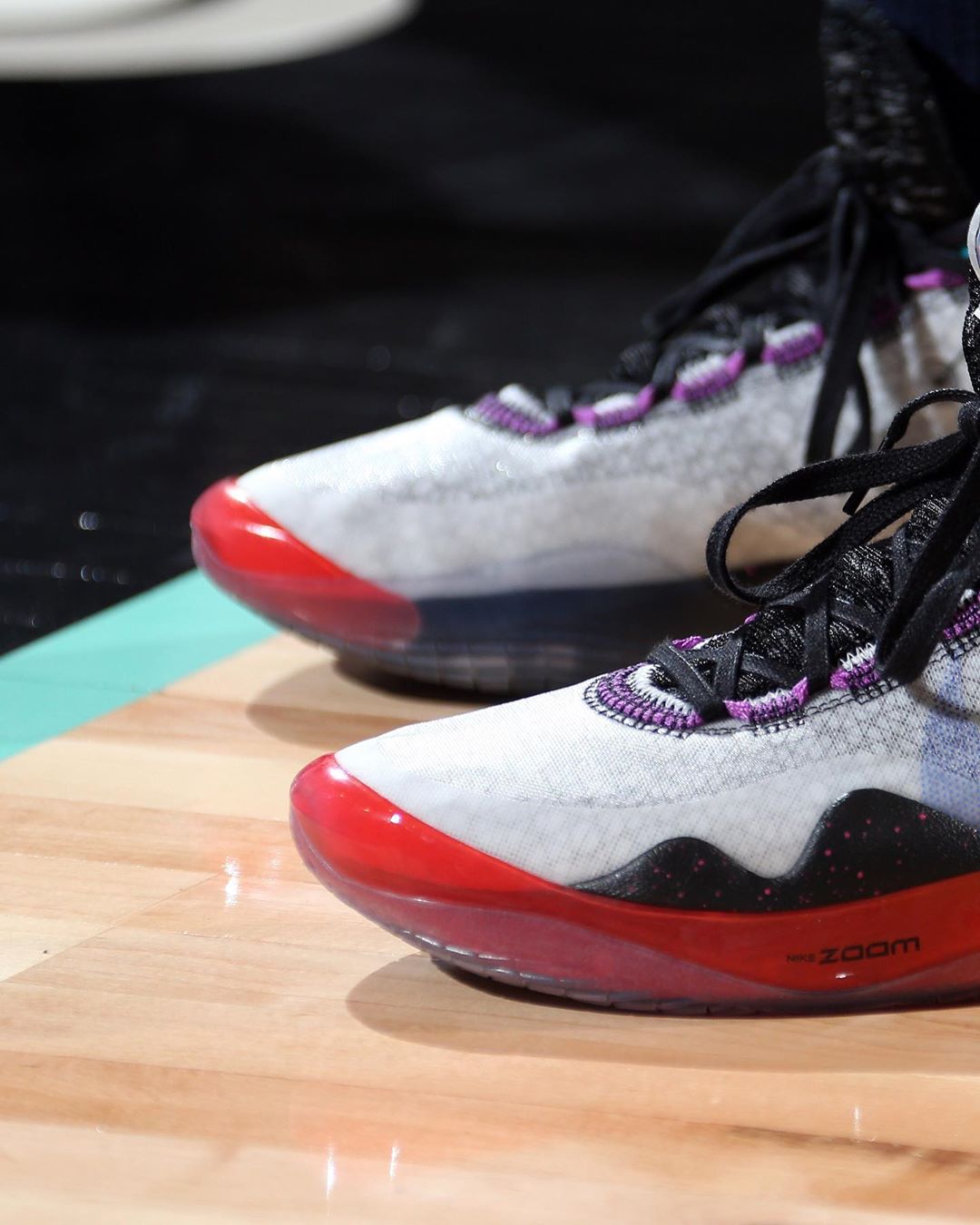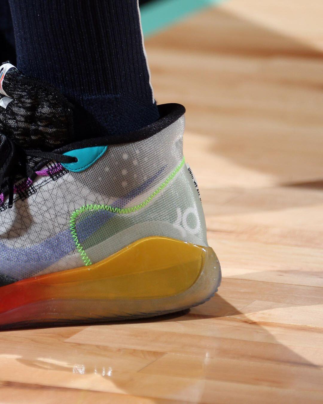 Nike Basketball 正式发布了凯文·杜兰特的最新签名战靴 KD12 之后,这双球鞋凭借着出众的脚感吸引了众多忠实粉丝。 ▼ KD12 概念设计稿 在近期的 WNBA 女篮比赛中,出现了一款全新配色的 KD12,按照外观判断应该是经典的 BETRUE 配色系列。 在此之前并未释出任何有关信息,比赛中球员的上脚应该是这款球鞋的首次曝光。 中底采用红黄渐变设计,搭配鞋舌处的经典彩虹标识,亮眼的外观设计令人十分期待这双鞋的正式发售。