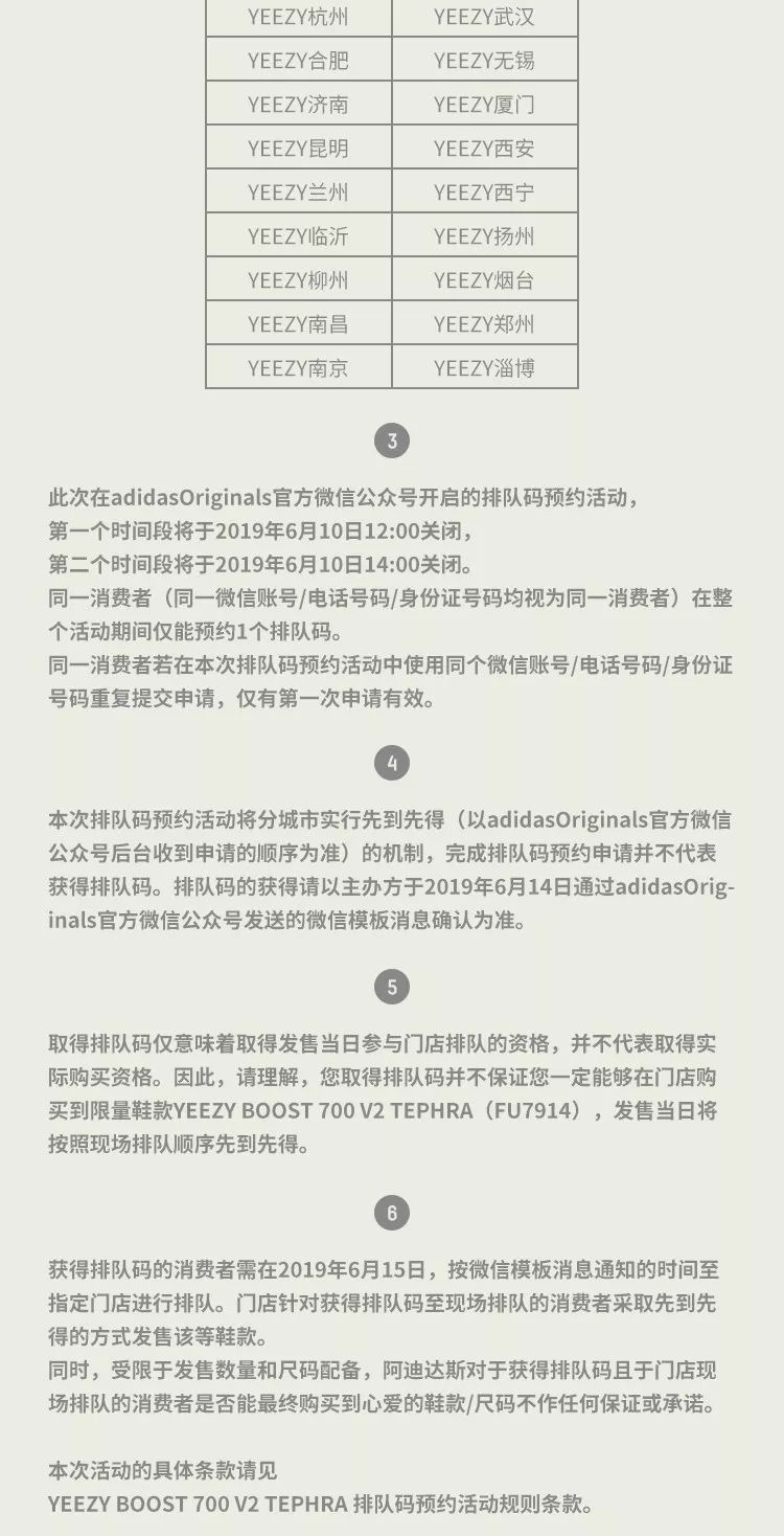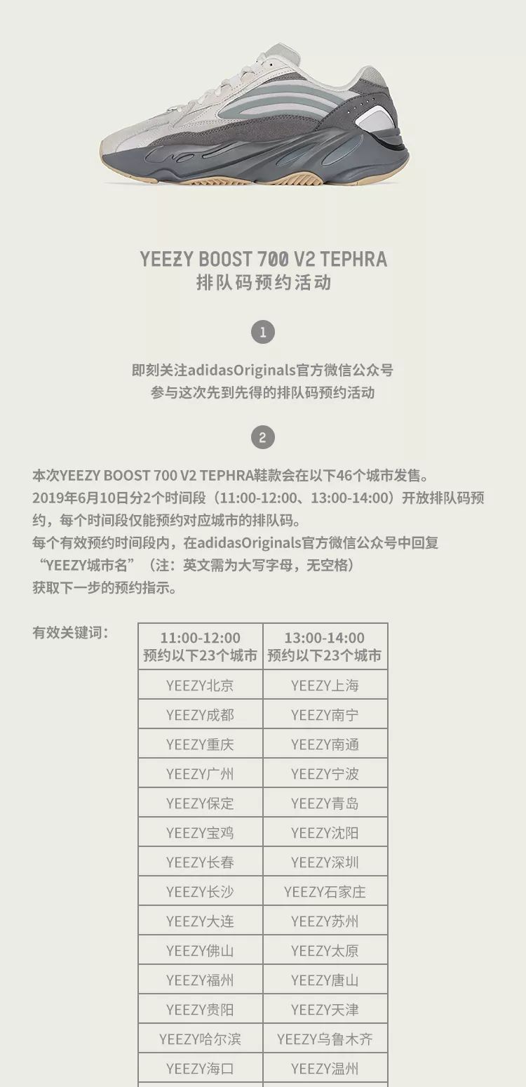 这双 Yeezy Boost 700 V2 将于 6 月 10 日在 adidasOriginals 开启限时预约,共有 46 个城市,预约方式与时间详见图表。