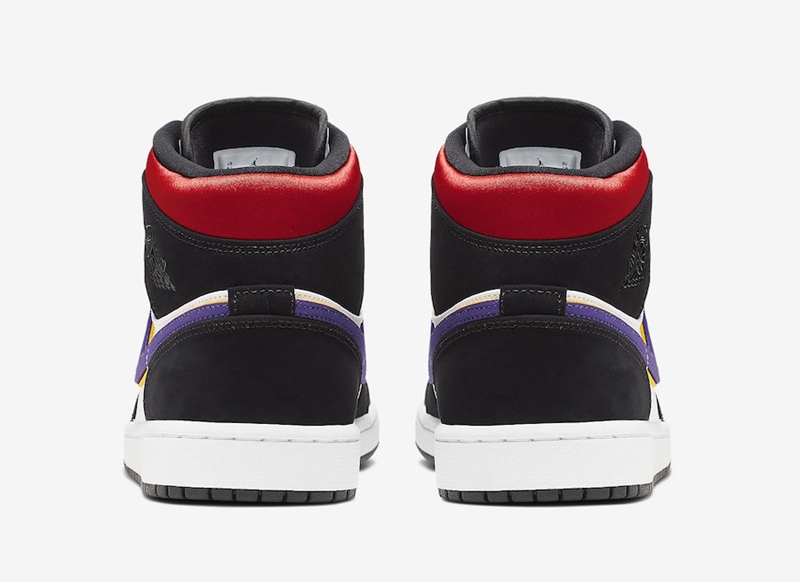 保留 Mid 中帮鞋型的干练外观,鞋头采用皇家蓝示人,鞋身侧面 Swoosh 使用湖人经典的黄紫点缀。鞋身被黑色麂皮包裹,鞋帮处使用红色搭配,多元化的配色设计,层次更加丰富。
