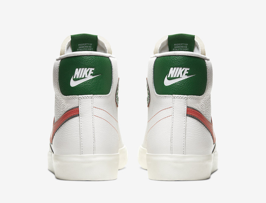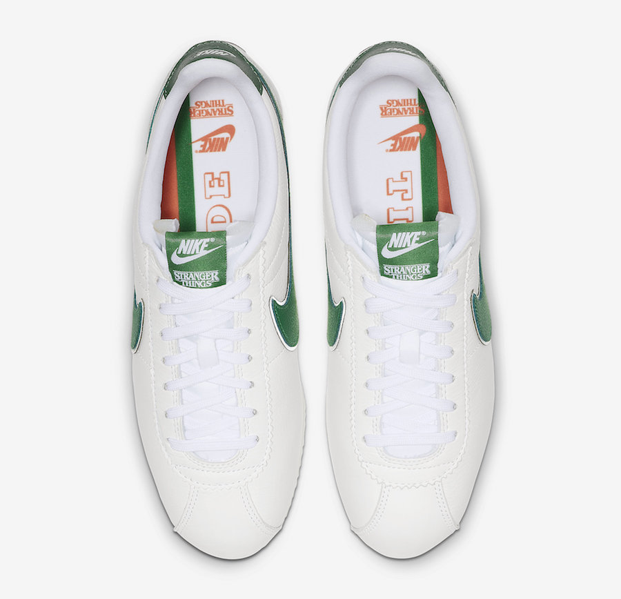 其中橙色与绿色的搭配代表了剧中主角们所在的 Hawkins 中学,鞋身还刺绣有「老虎」校徽彰显主题。