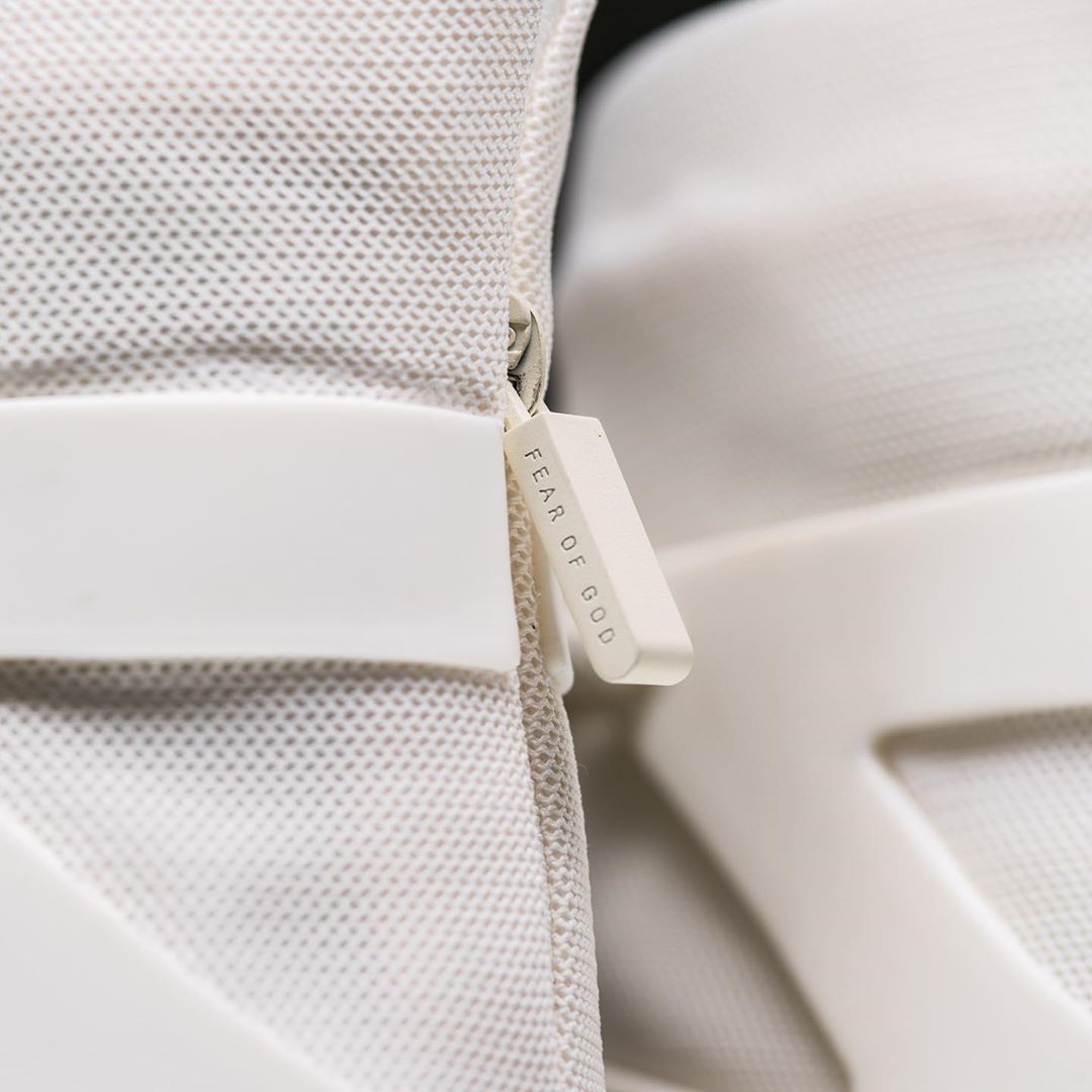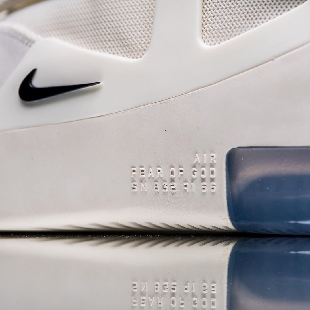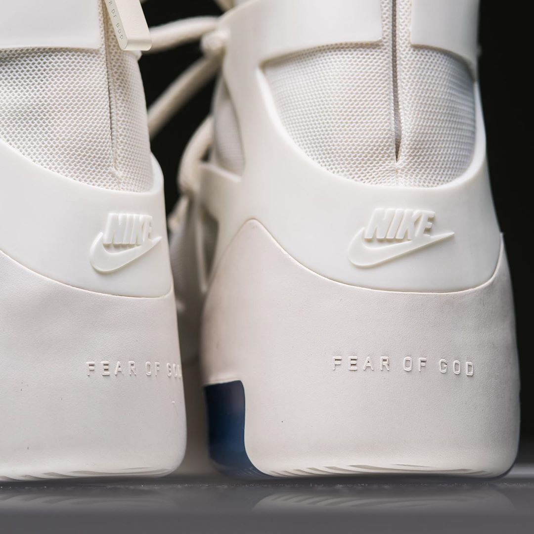 鞋跟处的 Nike 经典 Logo 与 Fear of God 标识均采用浮雕字体形式呈现,质感十足。