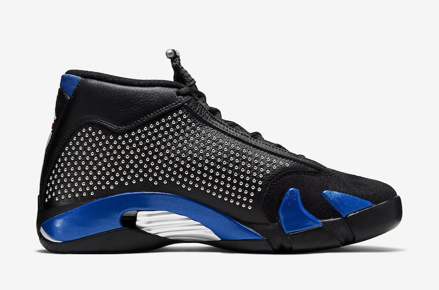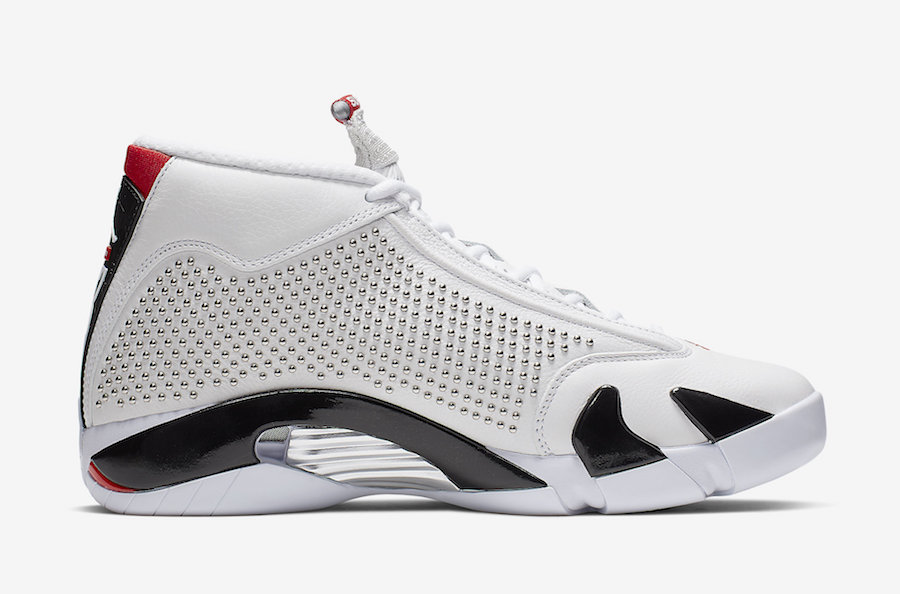 分别以白红和黑蓝配色呈现,以 Michael Jordan 曾经的皮衣夹克装扮为灵感来源,在鞋身的各个方位都呈现了整齐的金属圆珠排列。