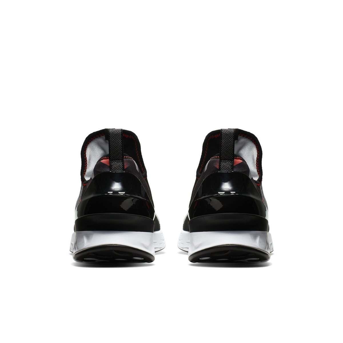 鞋领以红色匝线勾勒,与鞋带配色相同。扇形后跟支撑,搭配黑、红、灰三色几何图案。