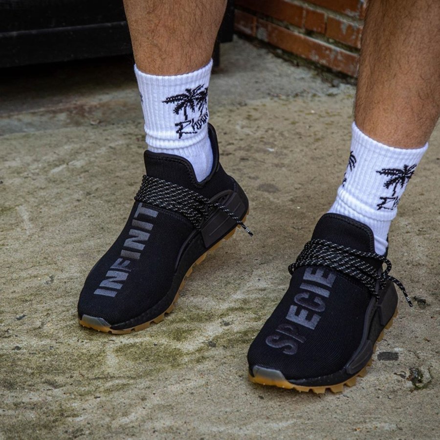 另一款以黑色作为主色调,从鞋面到中底均为纯黑配色,搭配生胶外底,看起来战斗气息十足。鞋面字体刺绣为 “INFINITY”(无限)和 “SPECIES”(物种)。