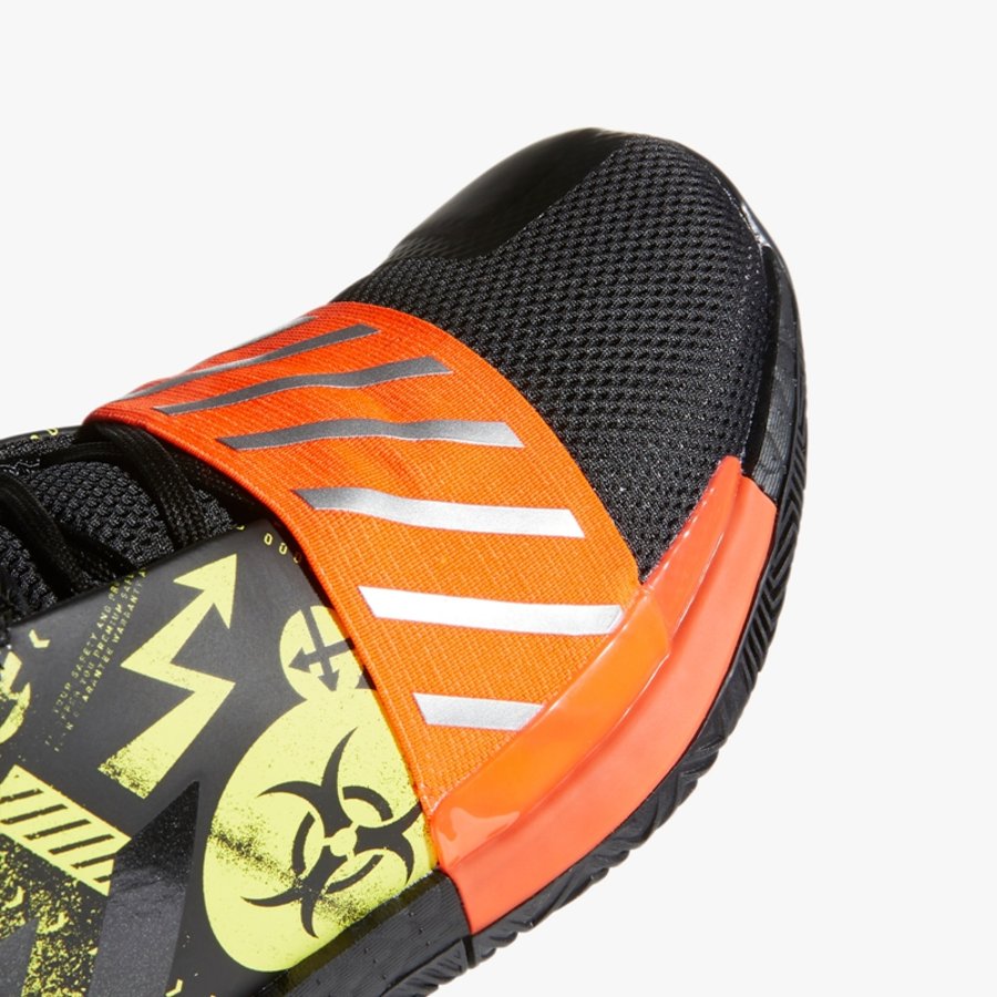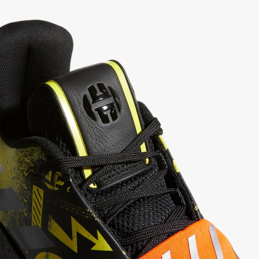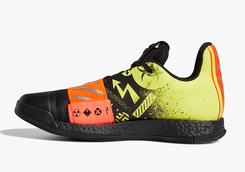 整体依然以黑黄装扮示人,细节辅以亮橙色点缀,鞋身中后部以喷漆形式呈现出生物危险标志、警戒线等元素,象征着哈登恐怖的赛场表现。唯一的改变是,移除鞋垫处原本的 MVP 字样。