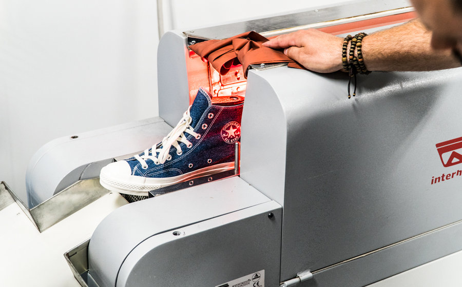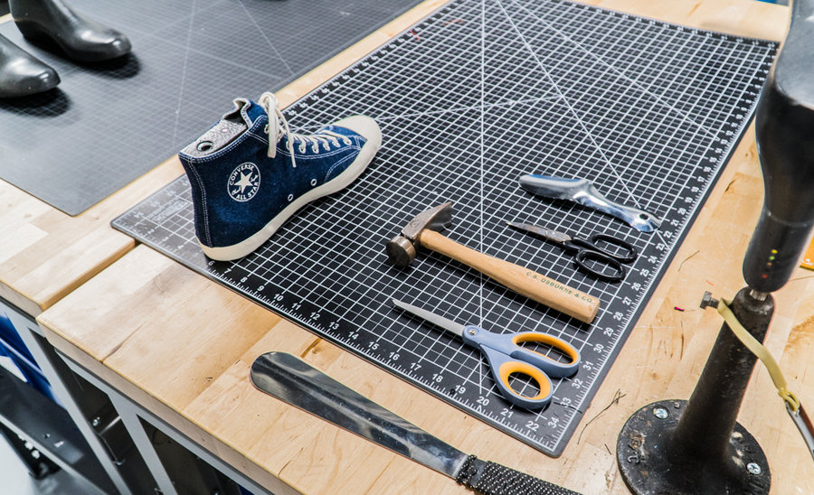 Coverse 每季会采购数万条牛仔裤,分成浅色、中色和深色三类,每条牛仔裤都经过 100% 的消毒和清洁并被切割加工制成鞋面。