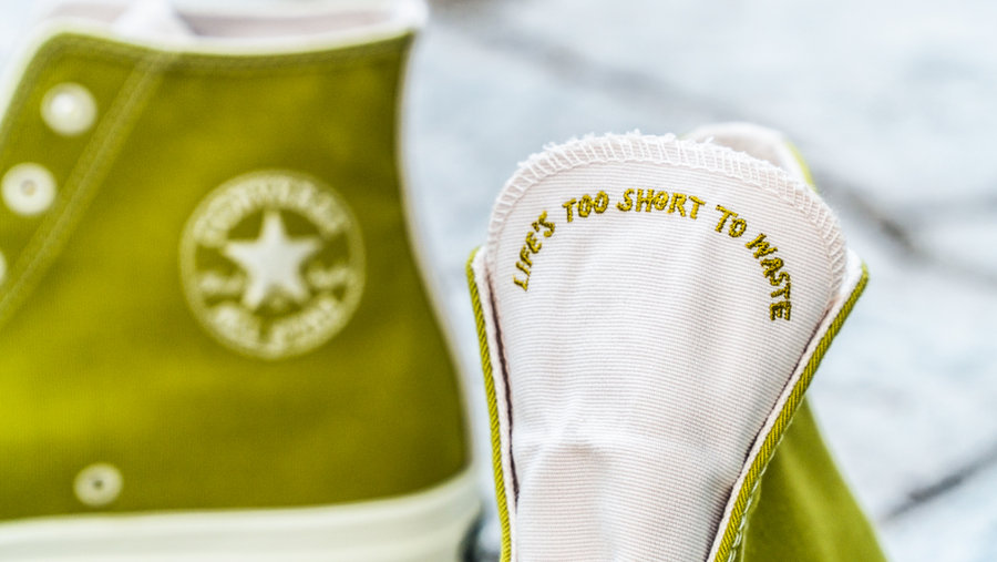 两只鞋的鞋舌都刺绣有 “LIFE'S TOO SHORT TO WASTE”,巧妙地表达出不要浪费的产品精神。